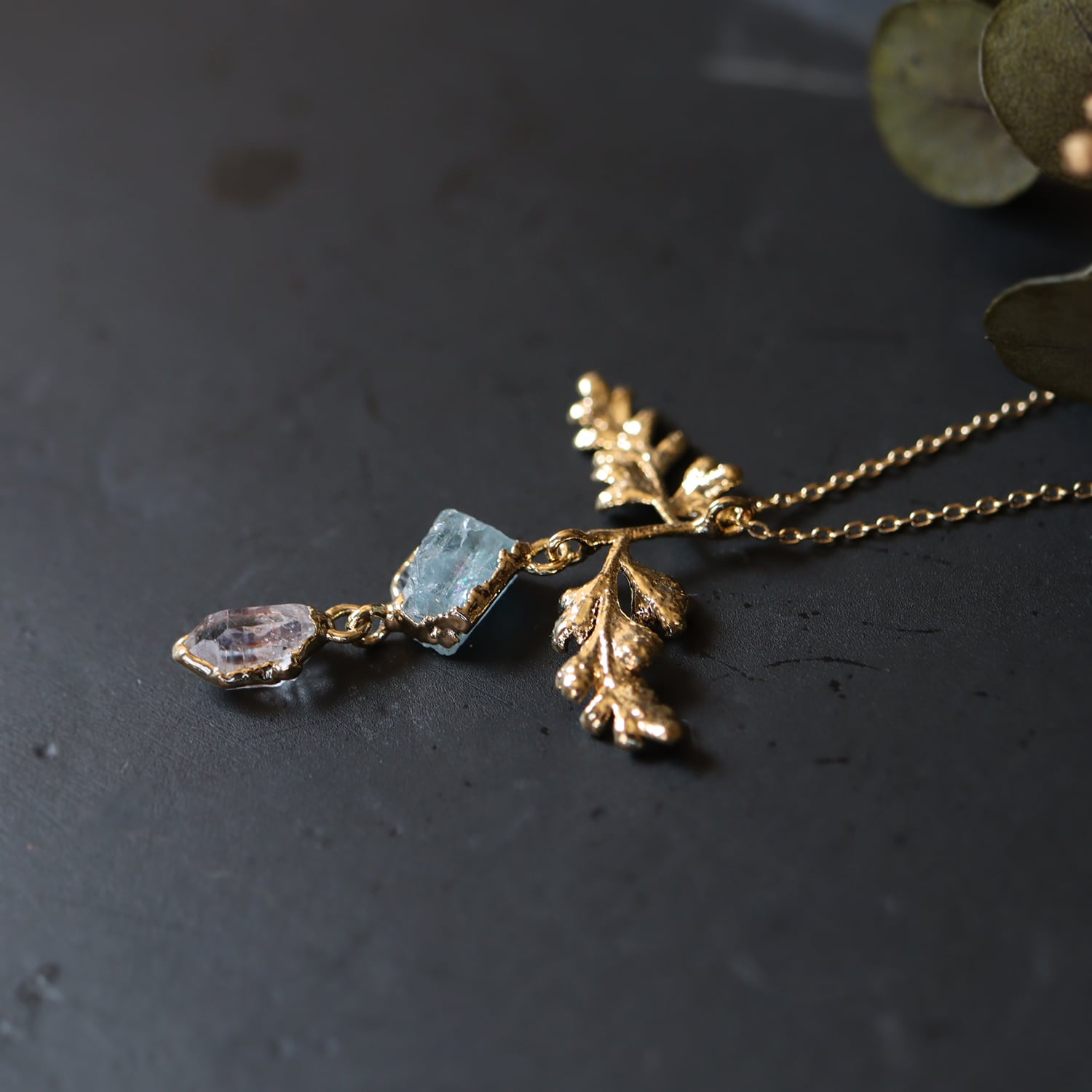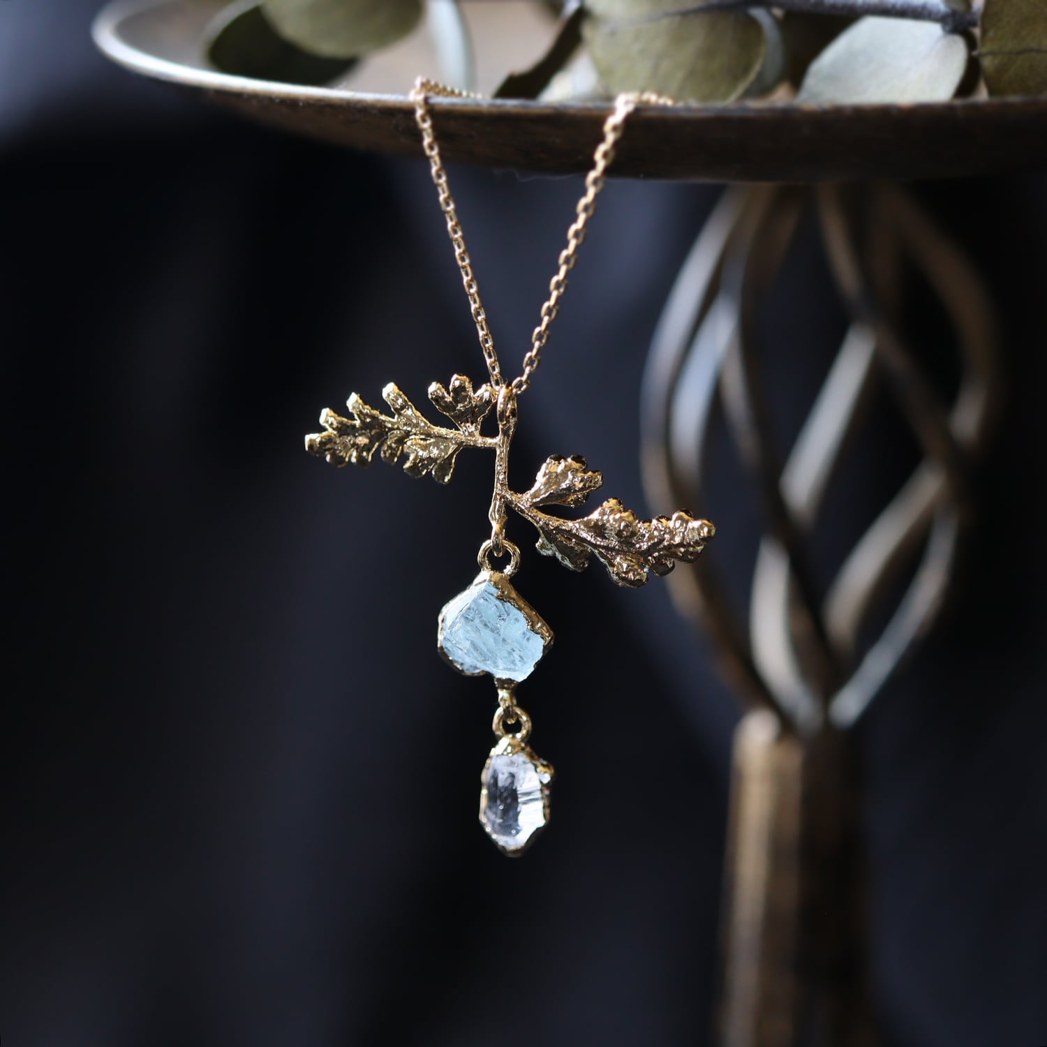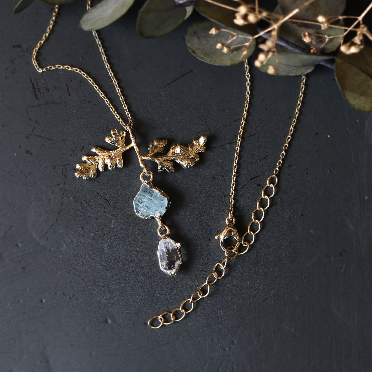 金の葉から、アクアマリンとダイヤモンドクォーツが滴るように揺れるネックレス。