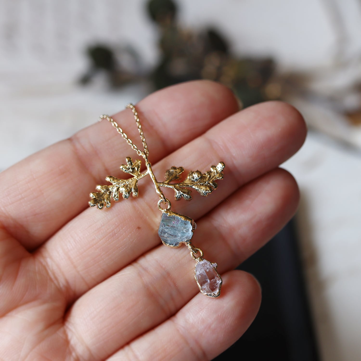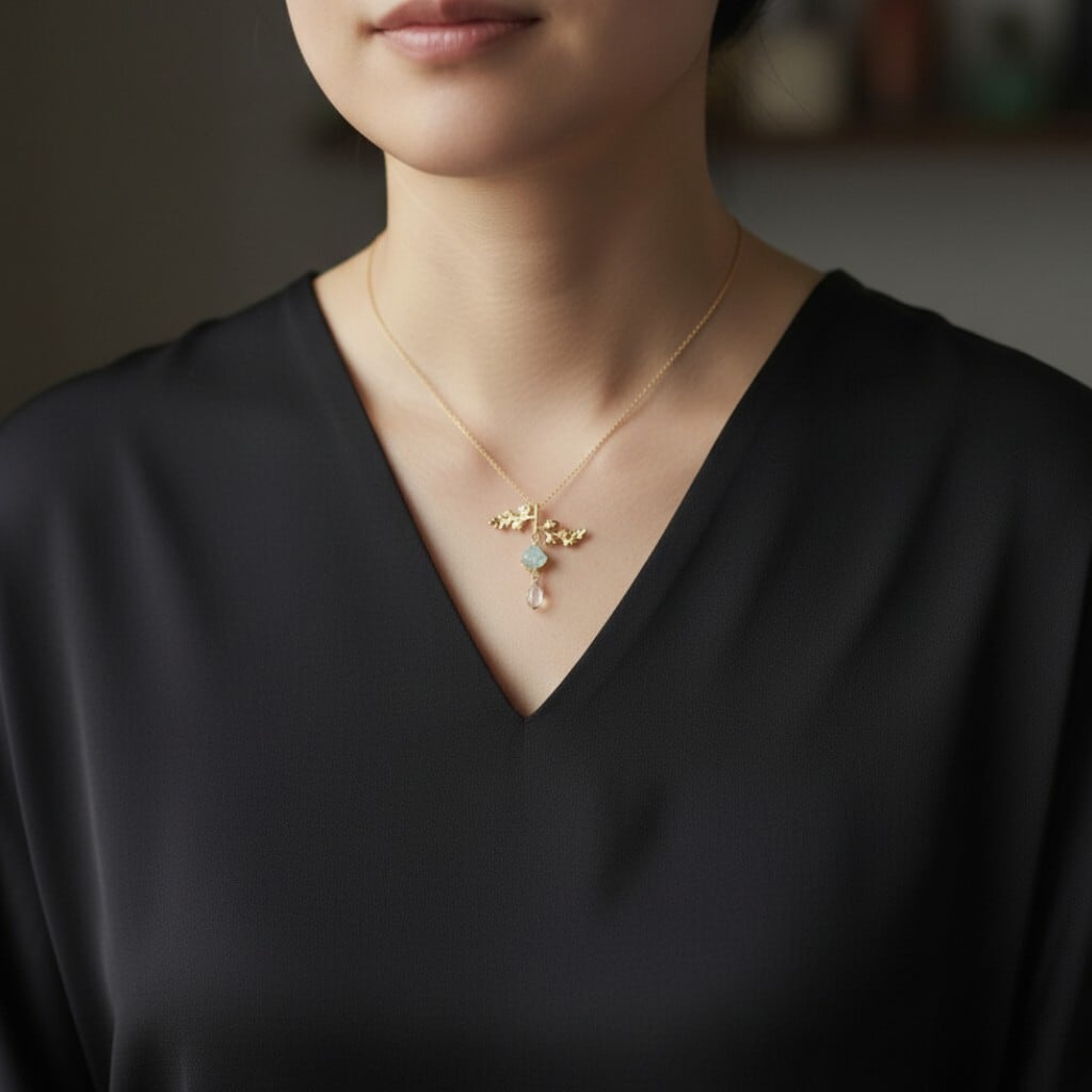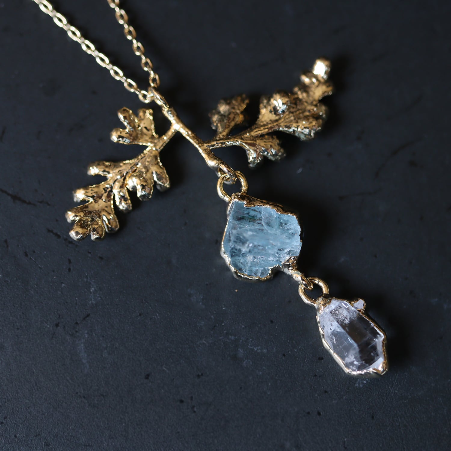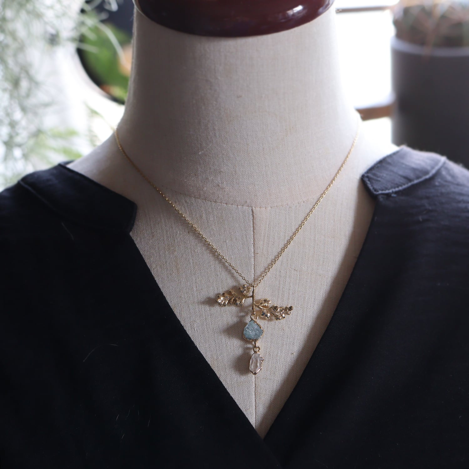 金の葉から、アクアマリンとダイヤモンドクォーツが滴るように揺れるネックレス。
