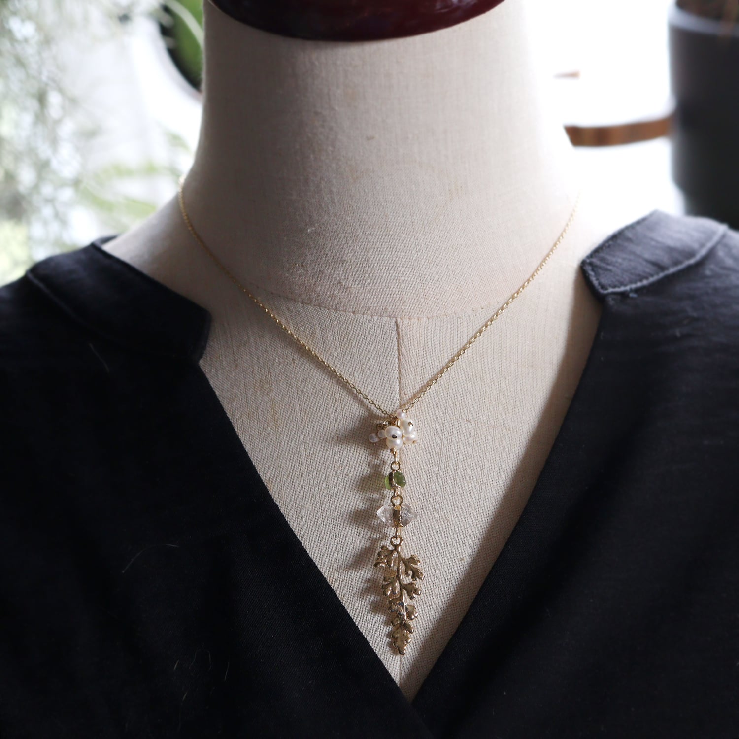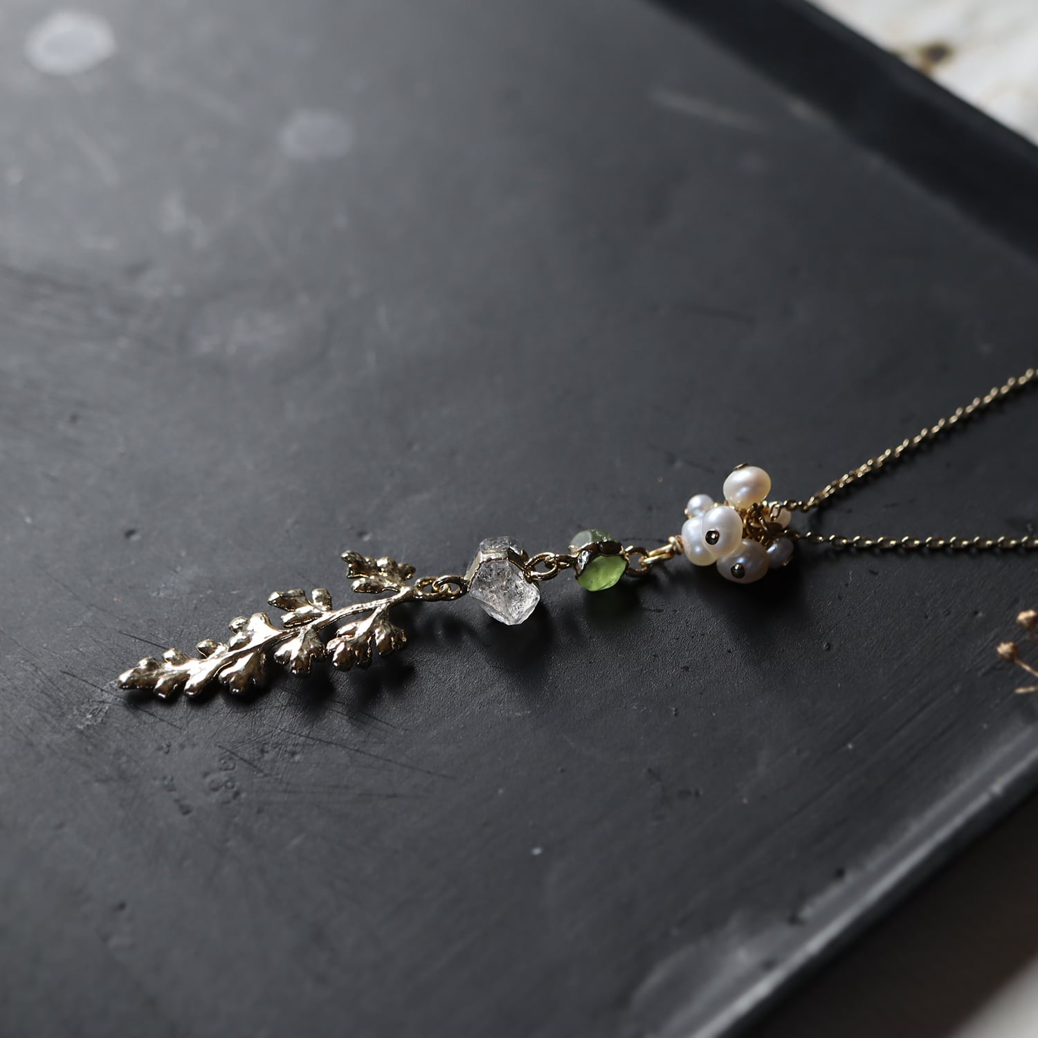 みずみずしい天然石と金の葉が連なって揺れるネックレス。