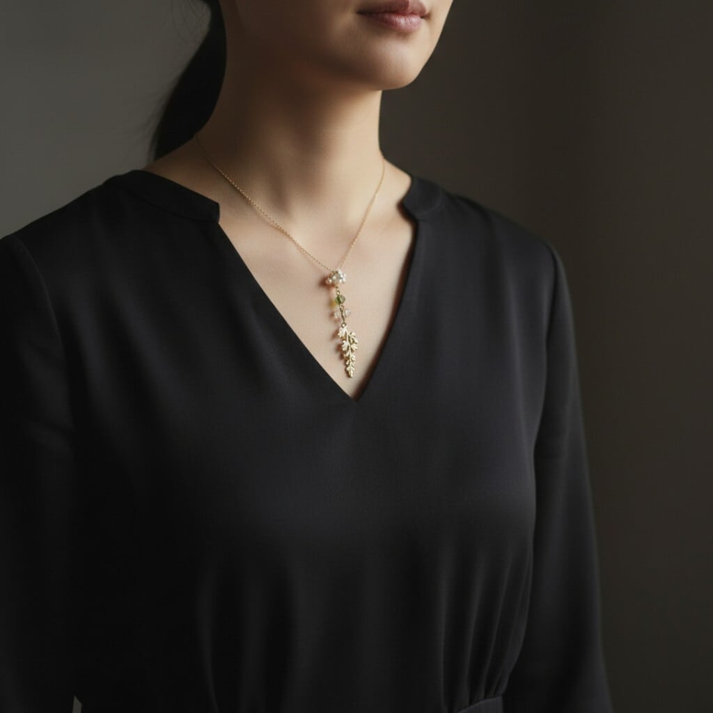 自然造形の美しさが胸元で静かに響き合い、神秘的なバランスで連なって揺れる一点です。