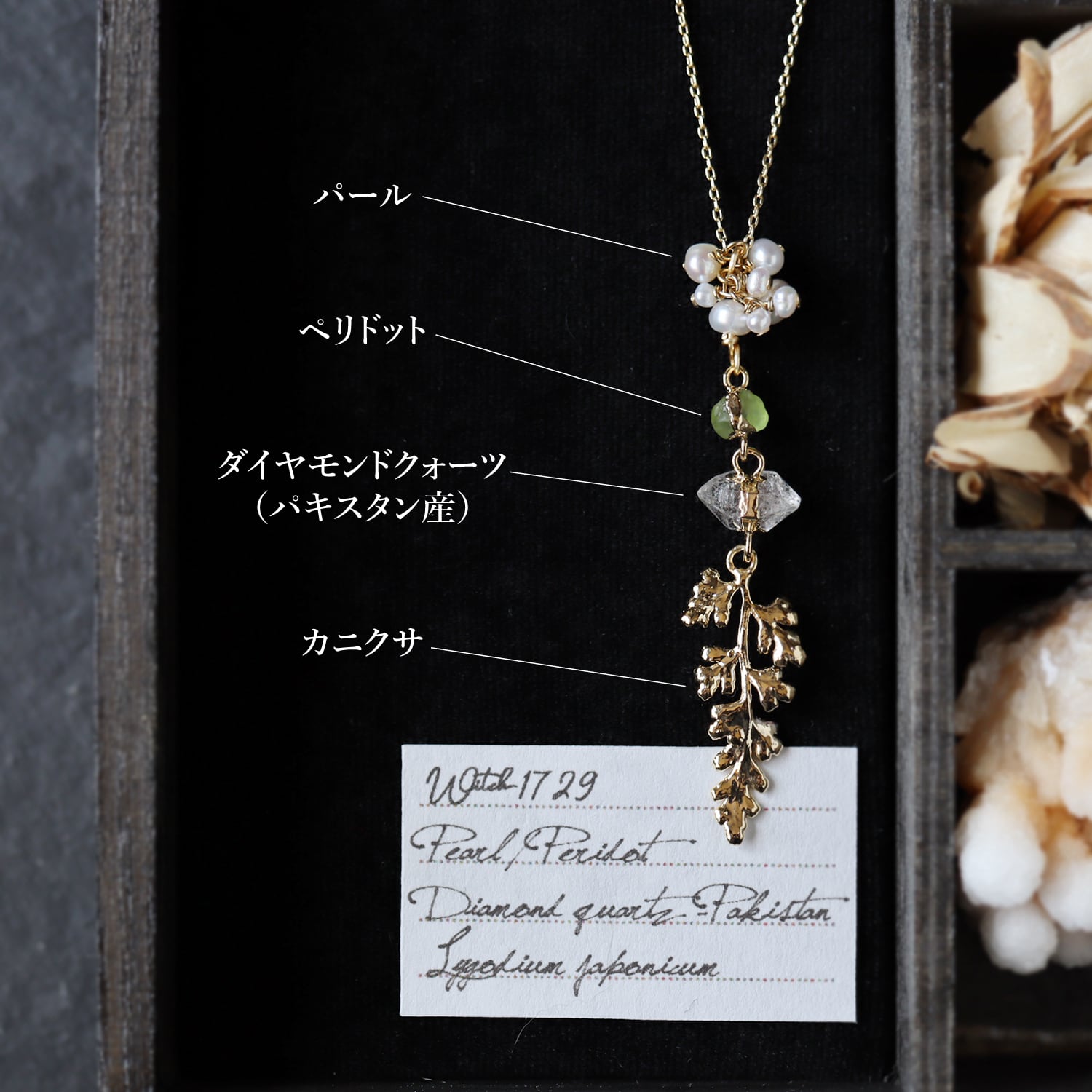 素材:パール・ペリドット・ダイヤモンドクォーツ(パキスタン産)・カニクサ(銅/K14ゴールドメッキ)・ゴールドプレート(ネックレス)