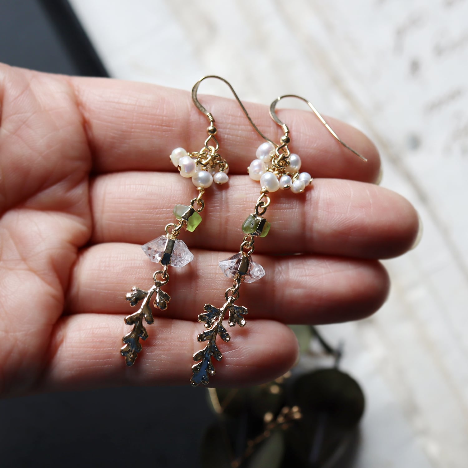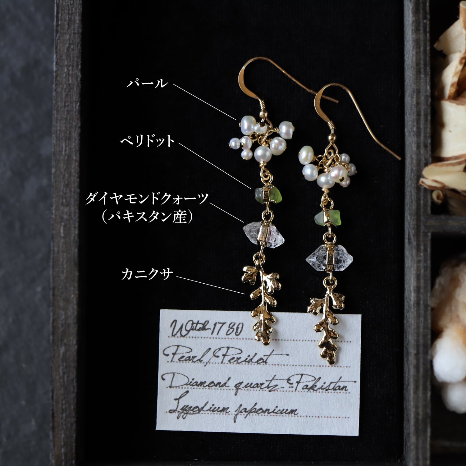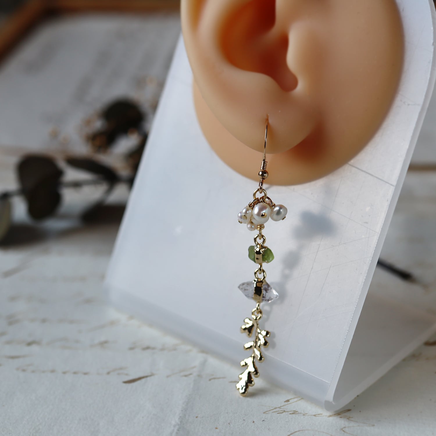 素材:パール・ペリドット・ダイヤモンドクォーツ(パキスタン産)・カニクサ(銅/K14ゴールドメッキ)・K14ゴールドフィルド(ピアス金具)