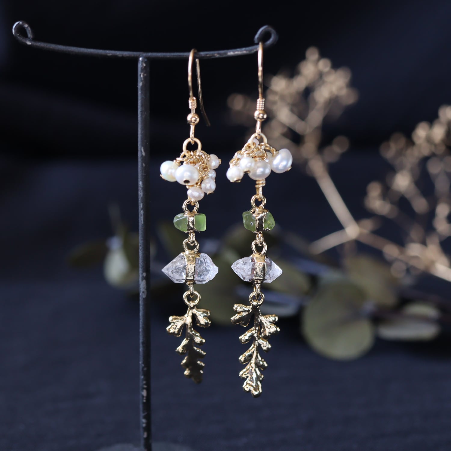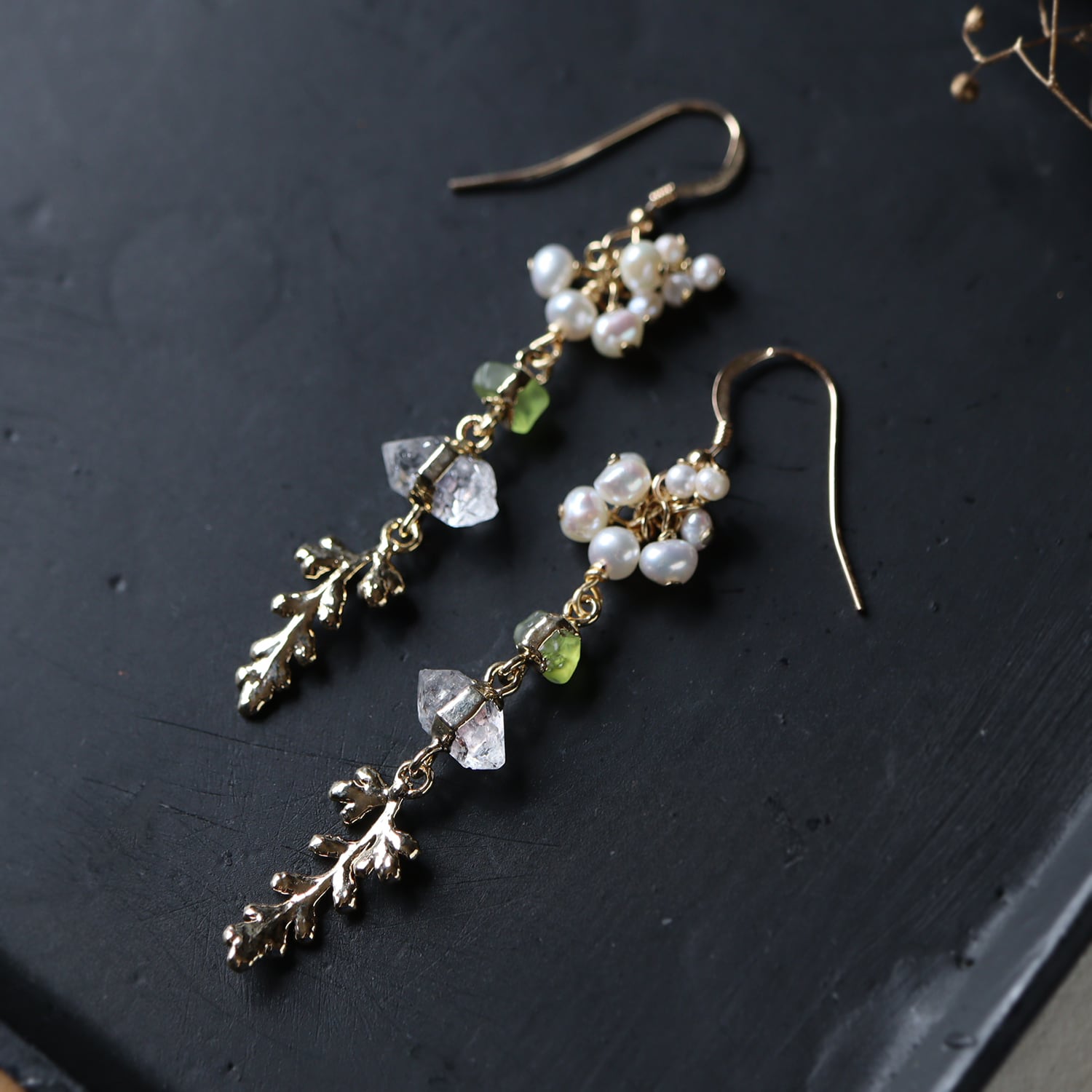 みずみずしい天然石と金の葉が連なって揺れるピアス。