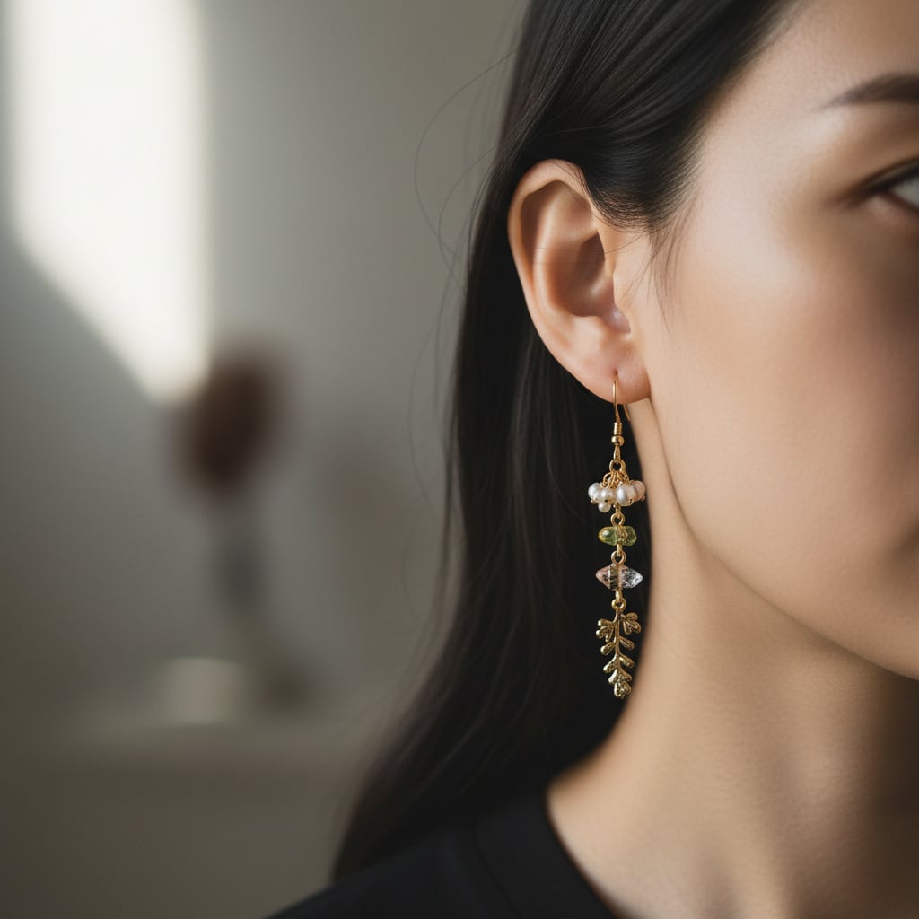 自然造形の美しさが耳元で静かに響き合い、神秘的なバランスで連なって揺れる一点です。