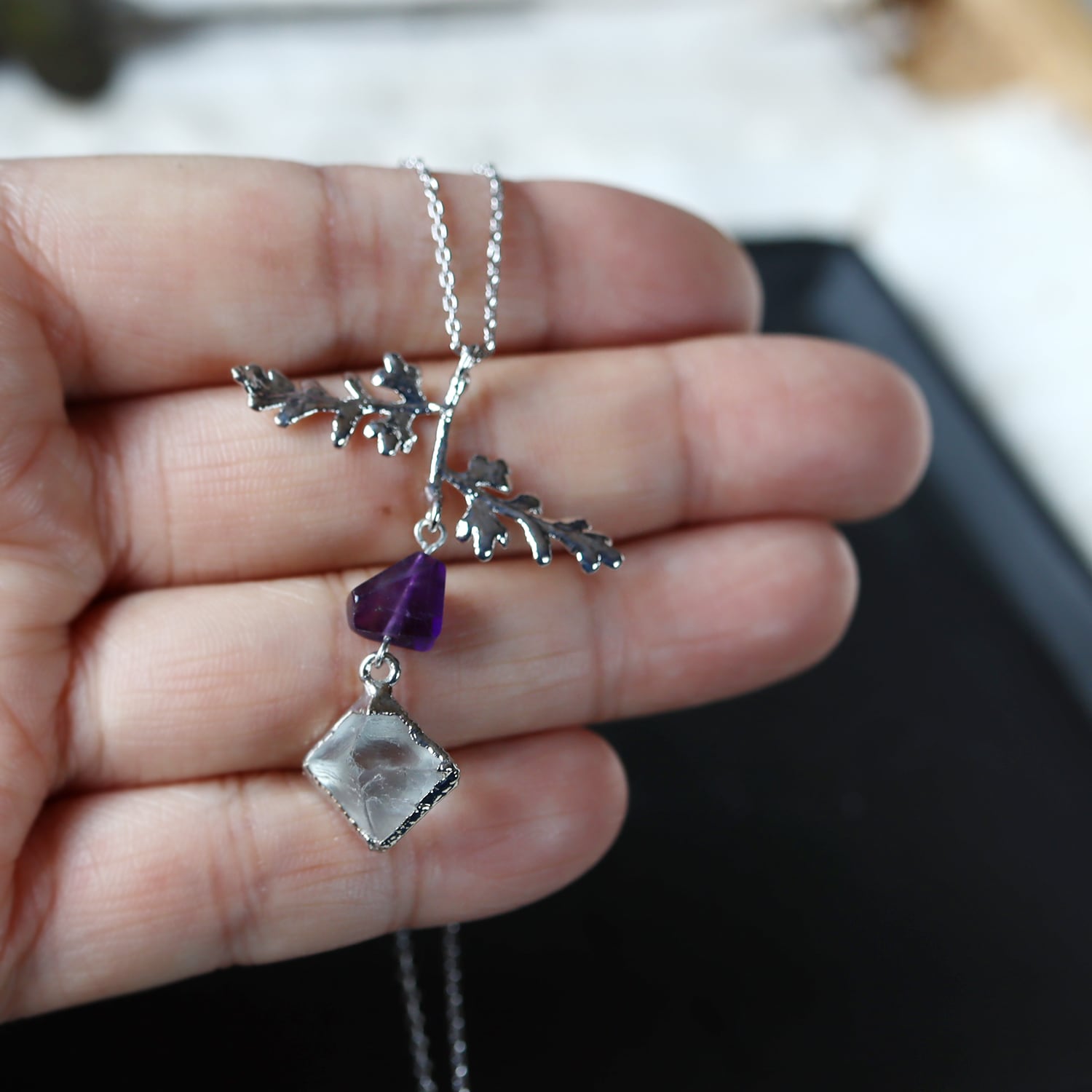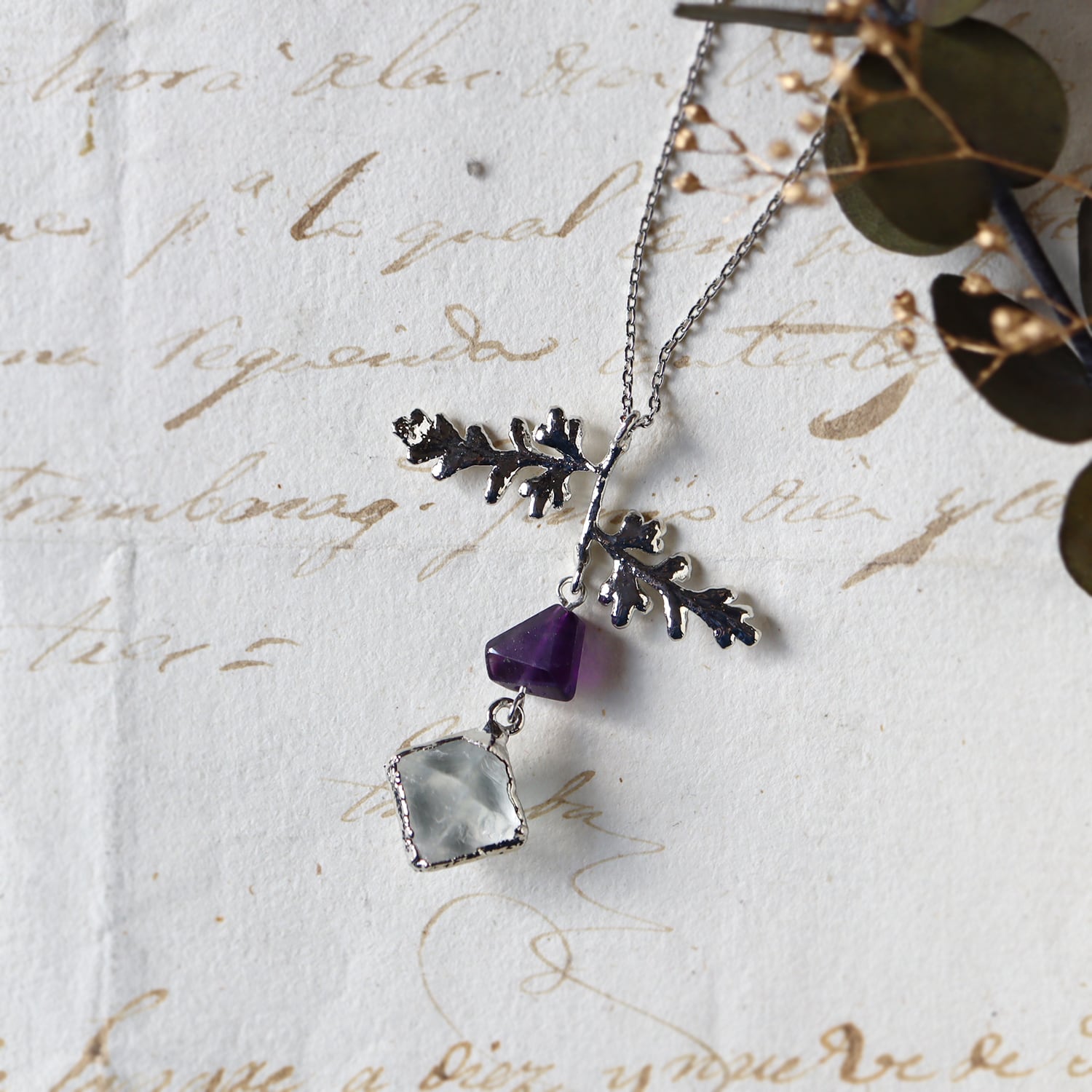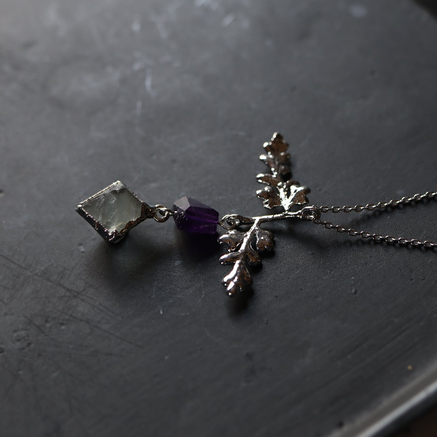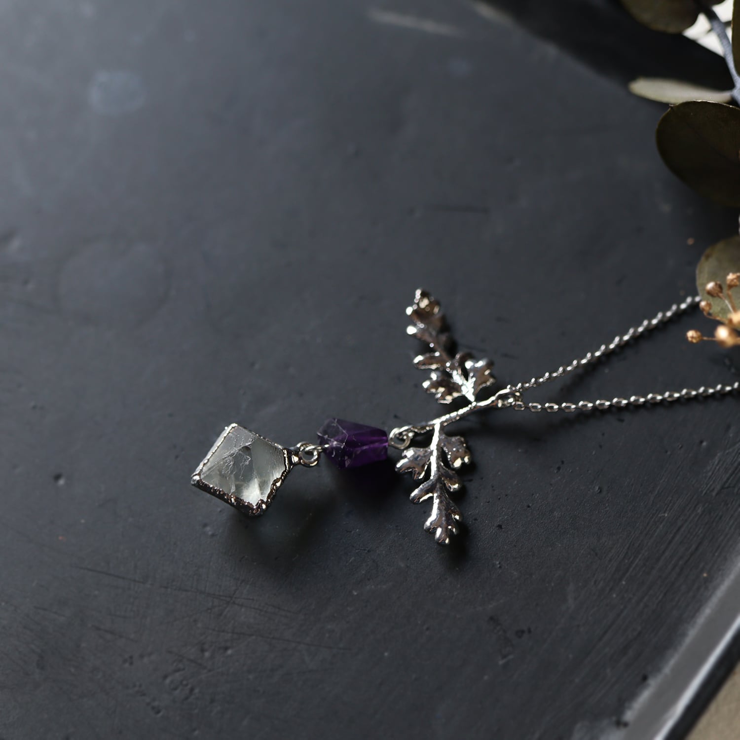 素材:カニクサ(銅/錫メッキ)・アメジスト・フローライト(中国産)・ロジウムメッキ(チェーン)