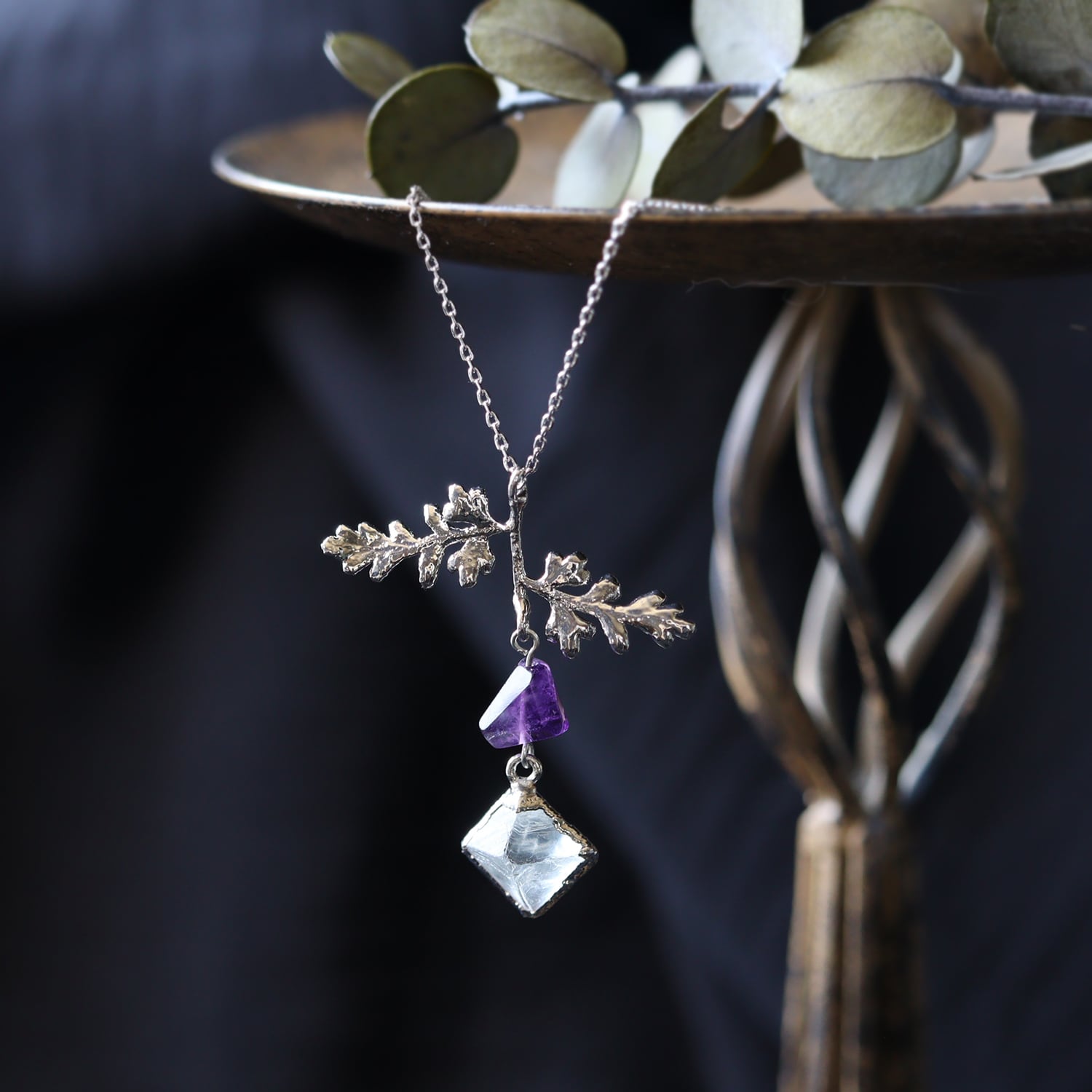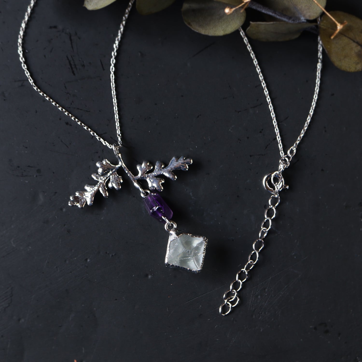 銀の葉とシックな天然石が連なって揺れるネックレス。