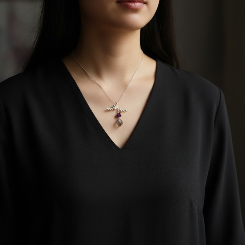 自然造形の美しさが胸元で静かに響き合い、神秘的なバランスで連なって揺れる一点です。