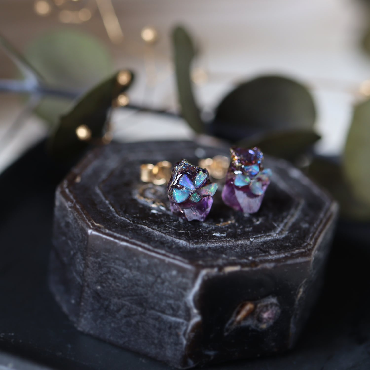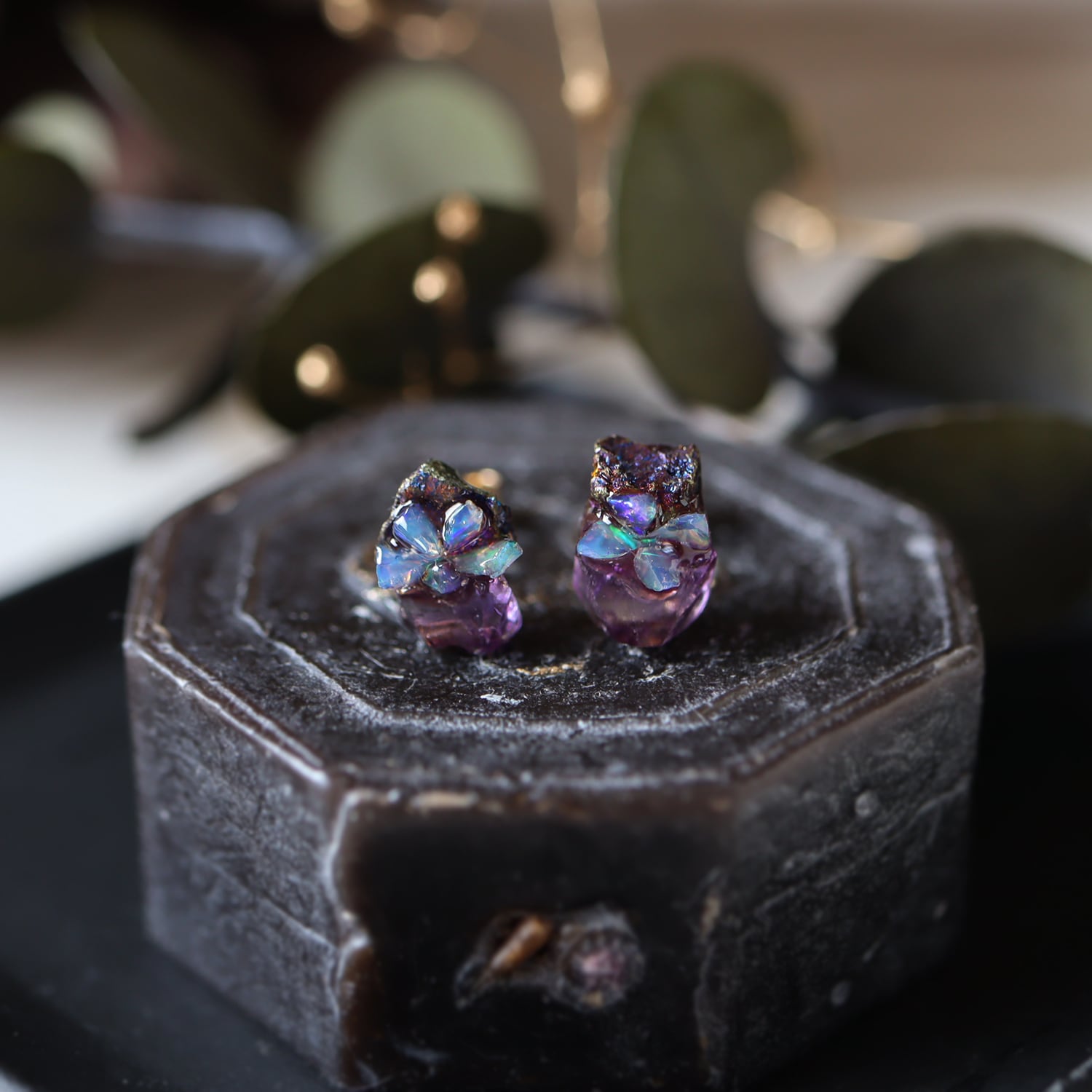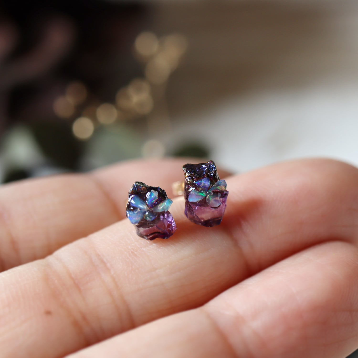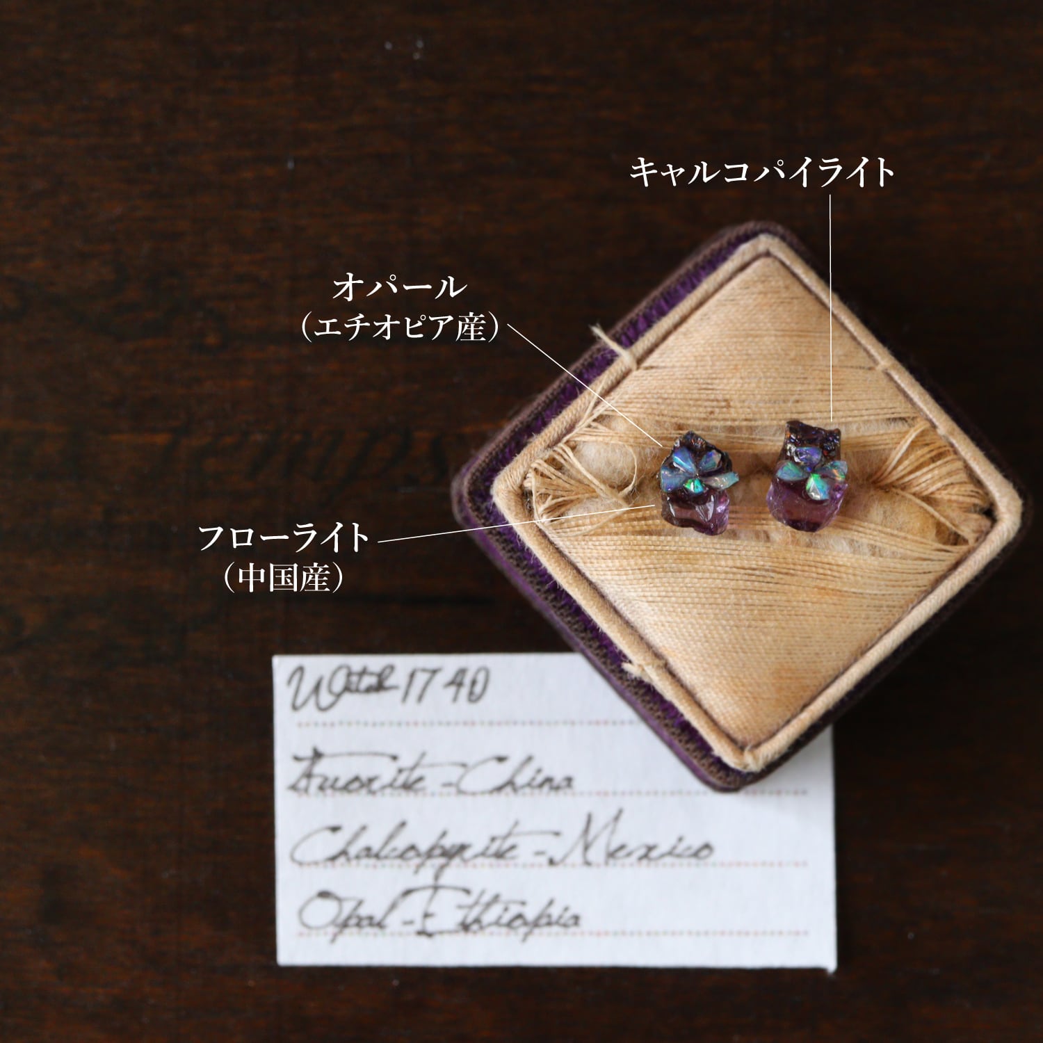 原石のキャルコパイライト・フローライト、オパールが共生し結晶した、創造上の鉱物「Unionite」のミニピアス。