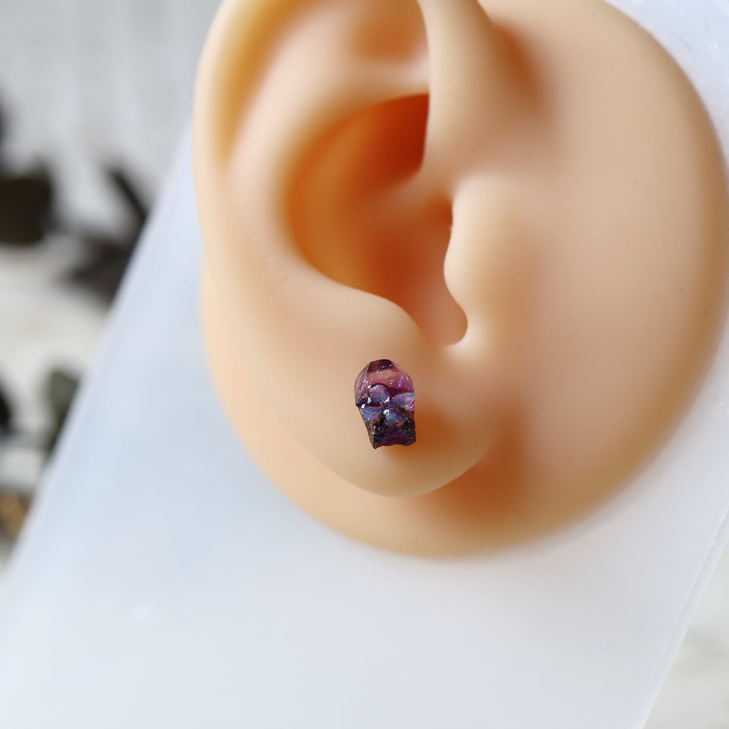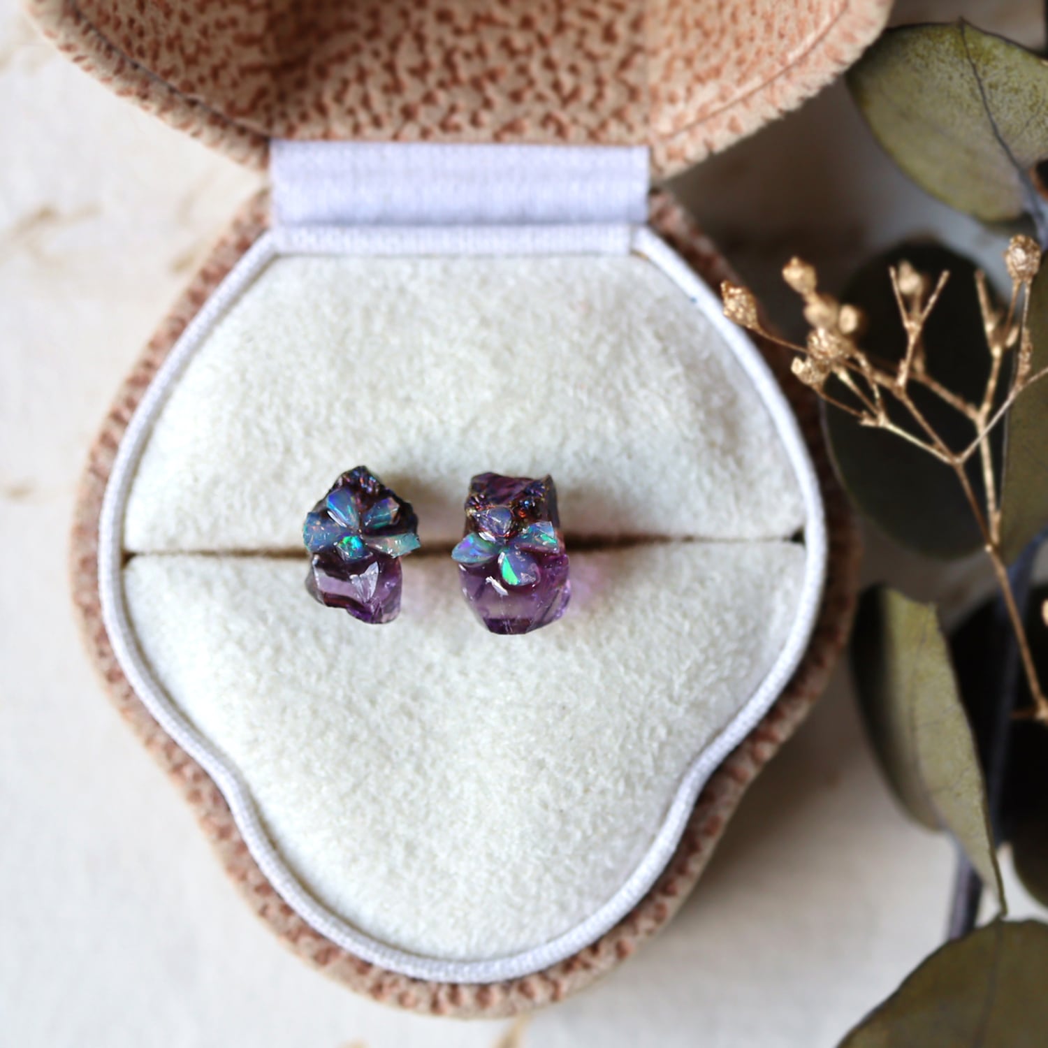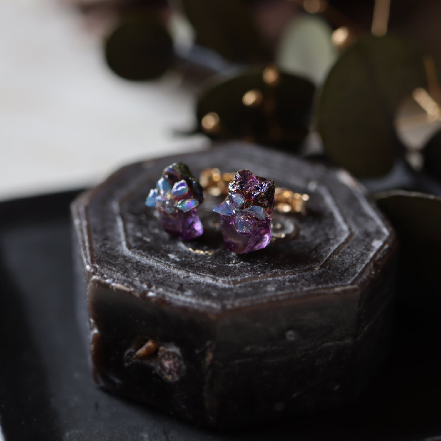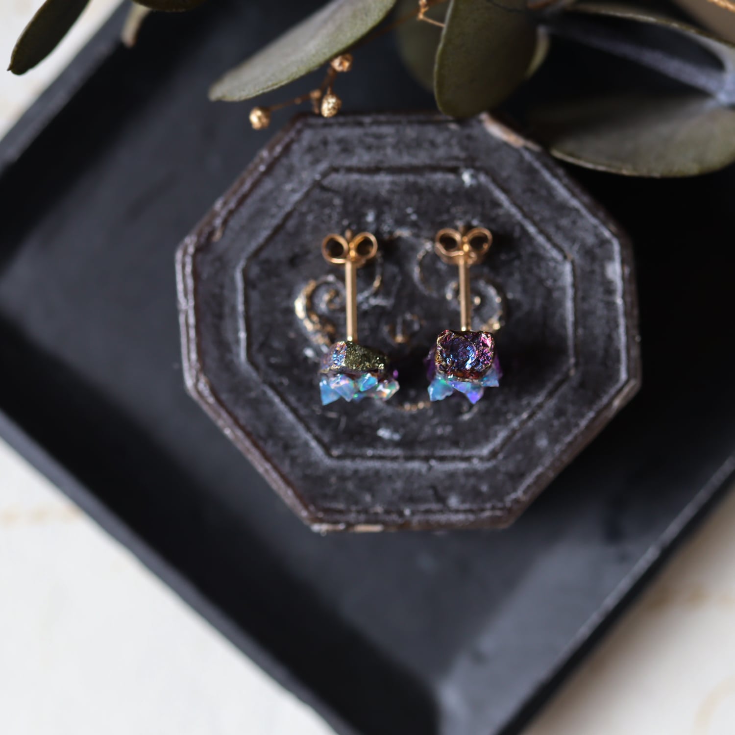 原石のキャルコパイライト・フローライト、オパールが共生し結晶した、創造上の鉱物「Unionite」のミニピアス。