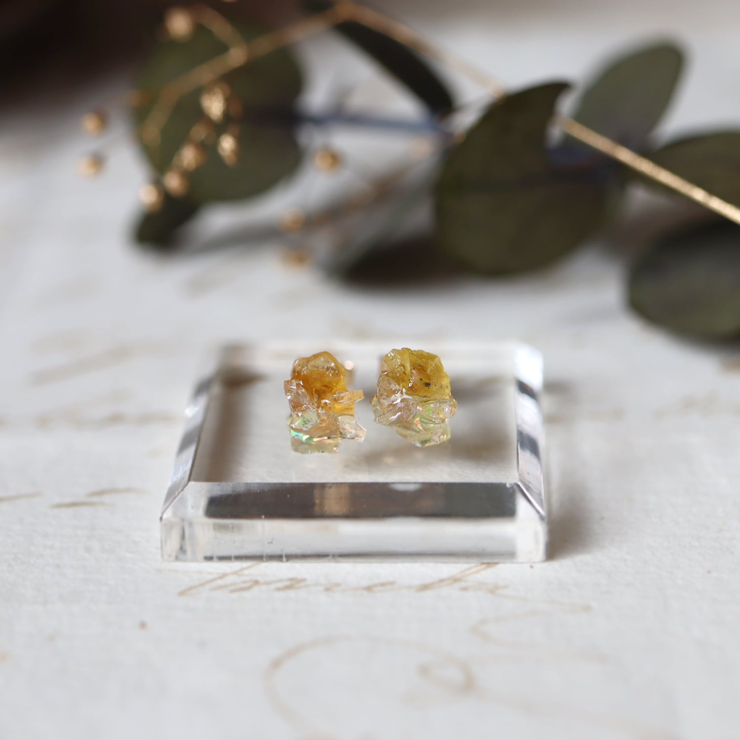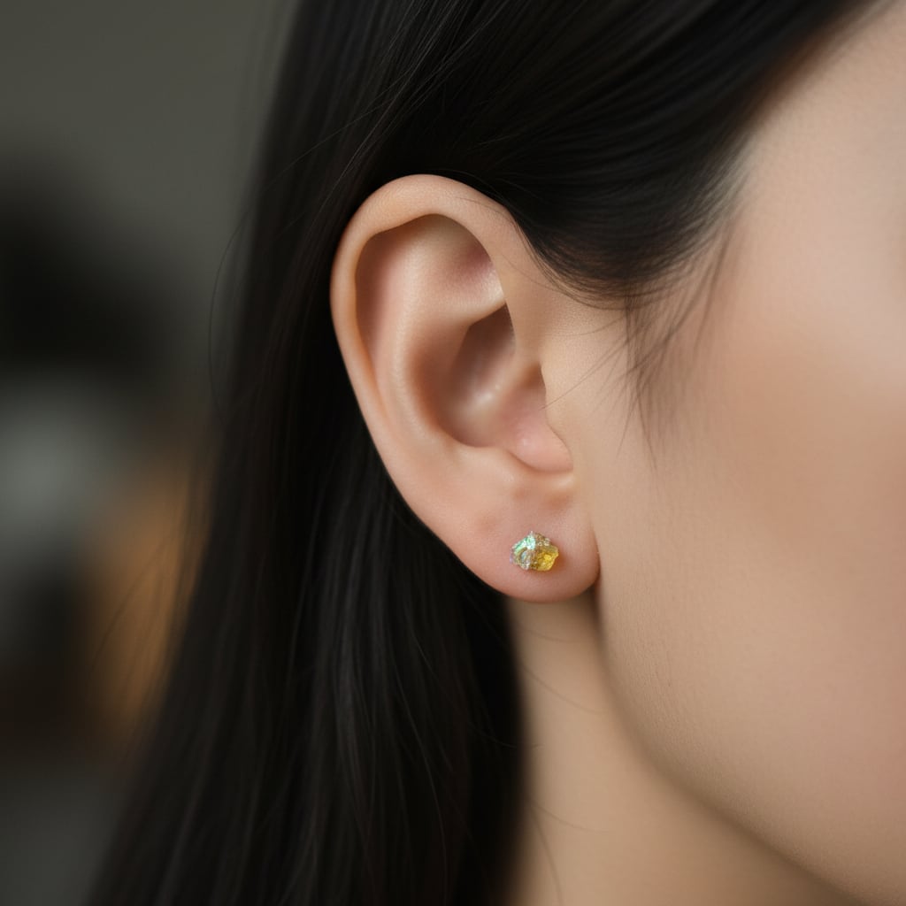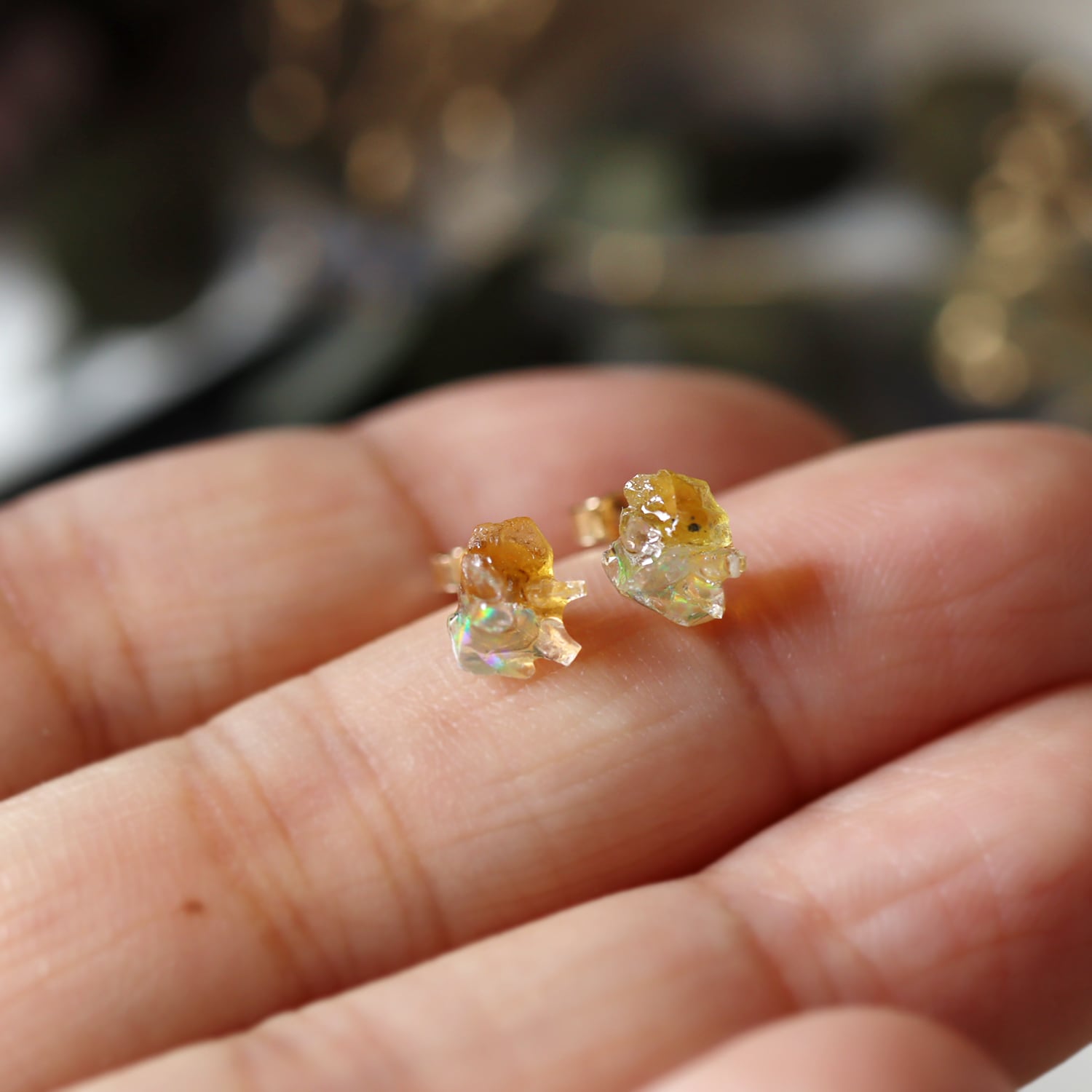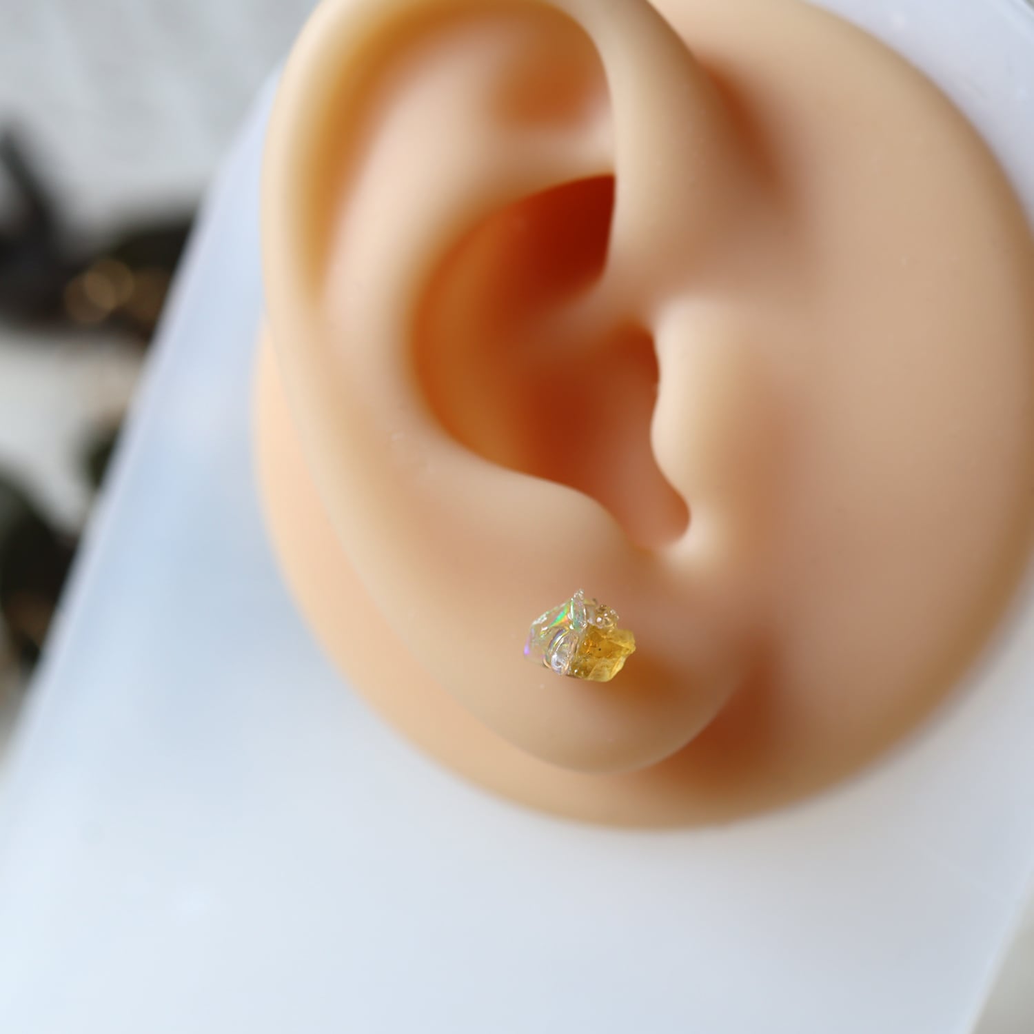 原石のオパール、イエローサファイア、ムーンストーンが共生し結晶した、創造上の鉱物「Unionite」のミニピアス。