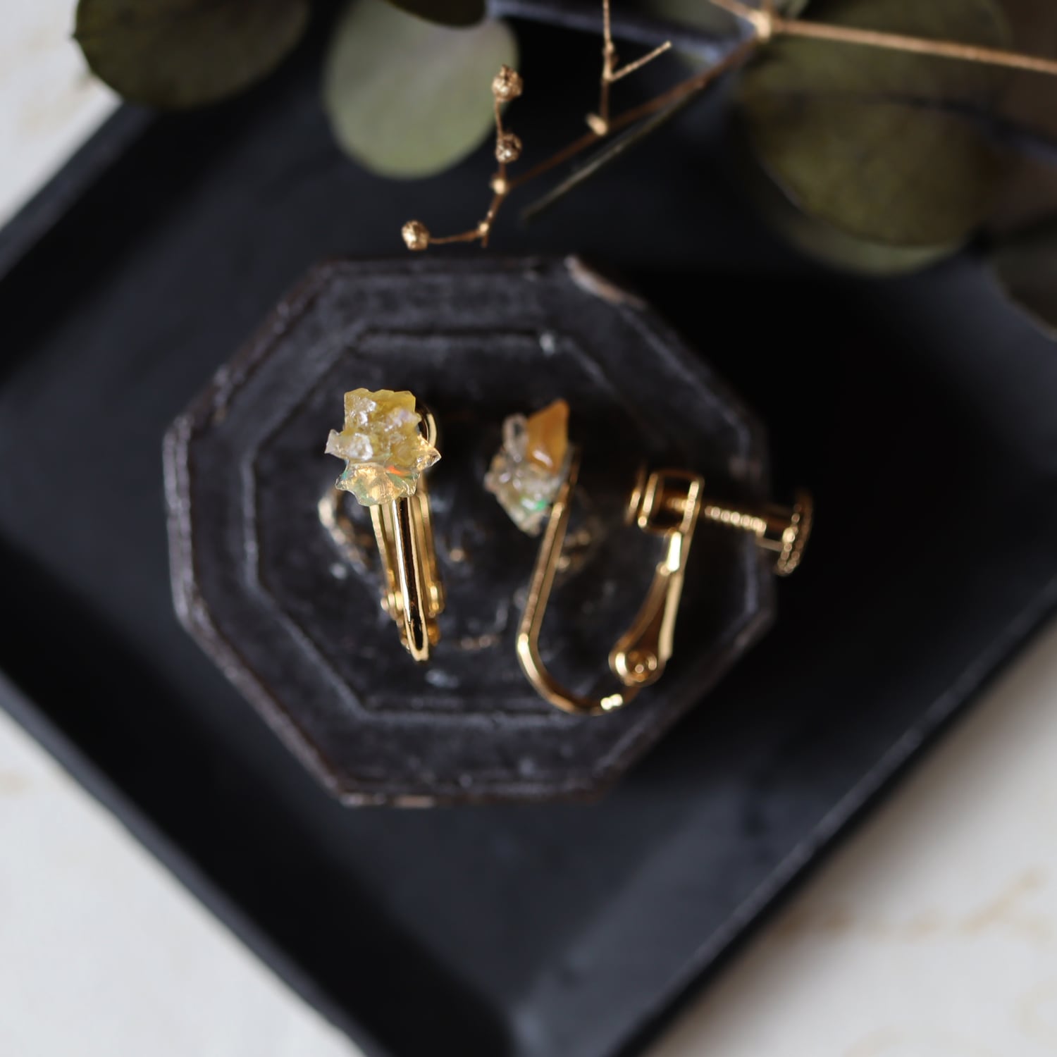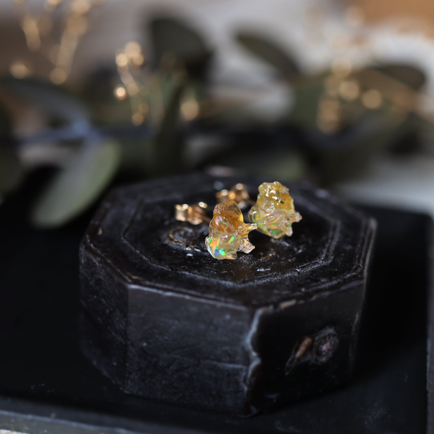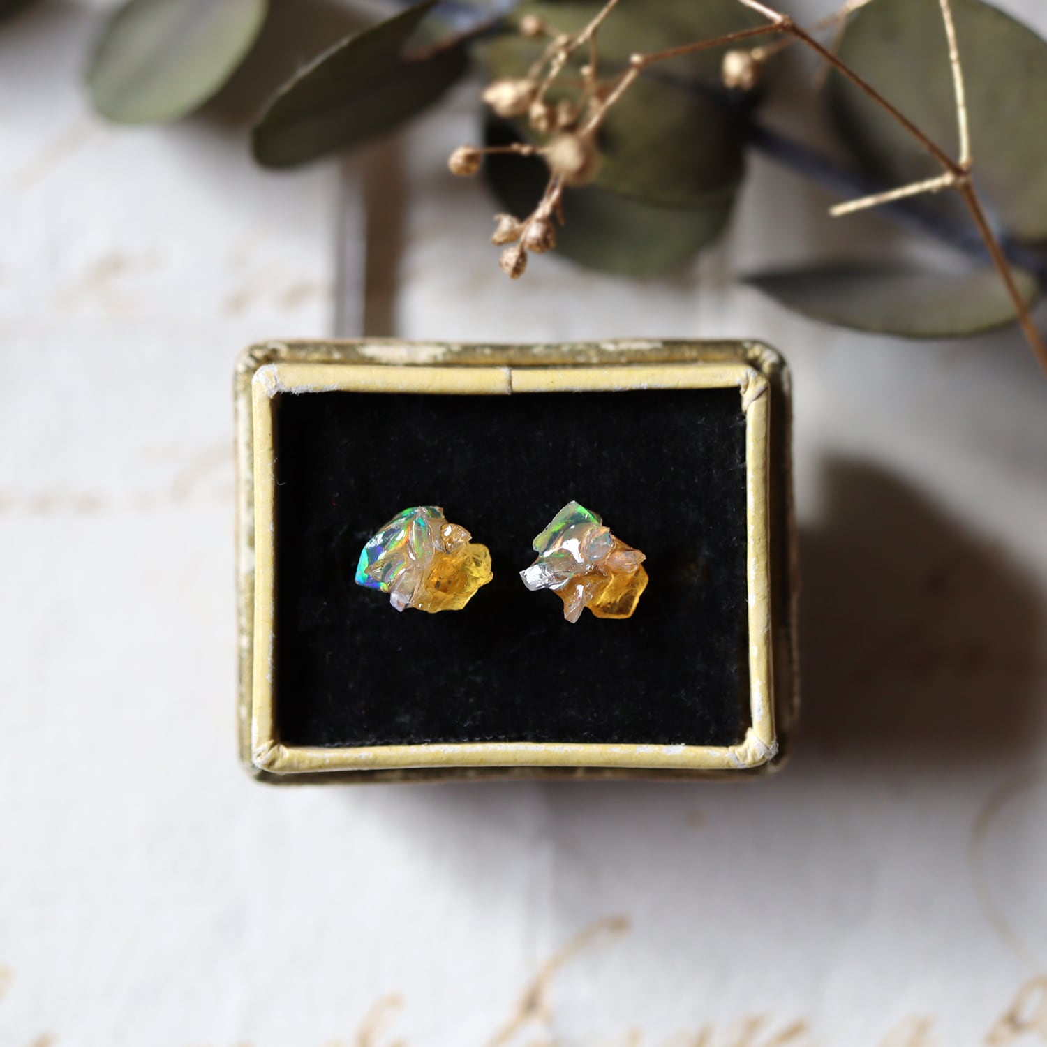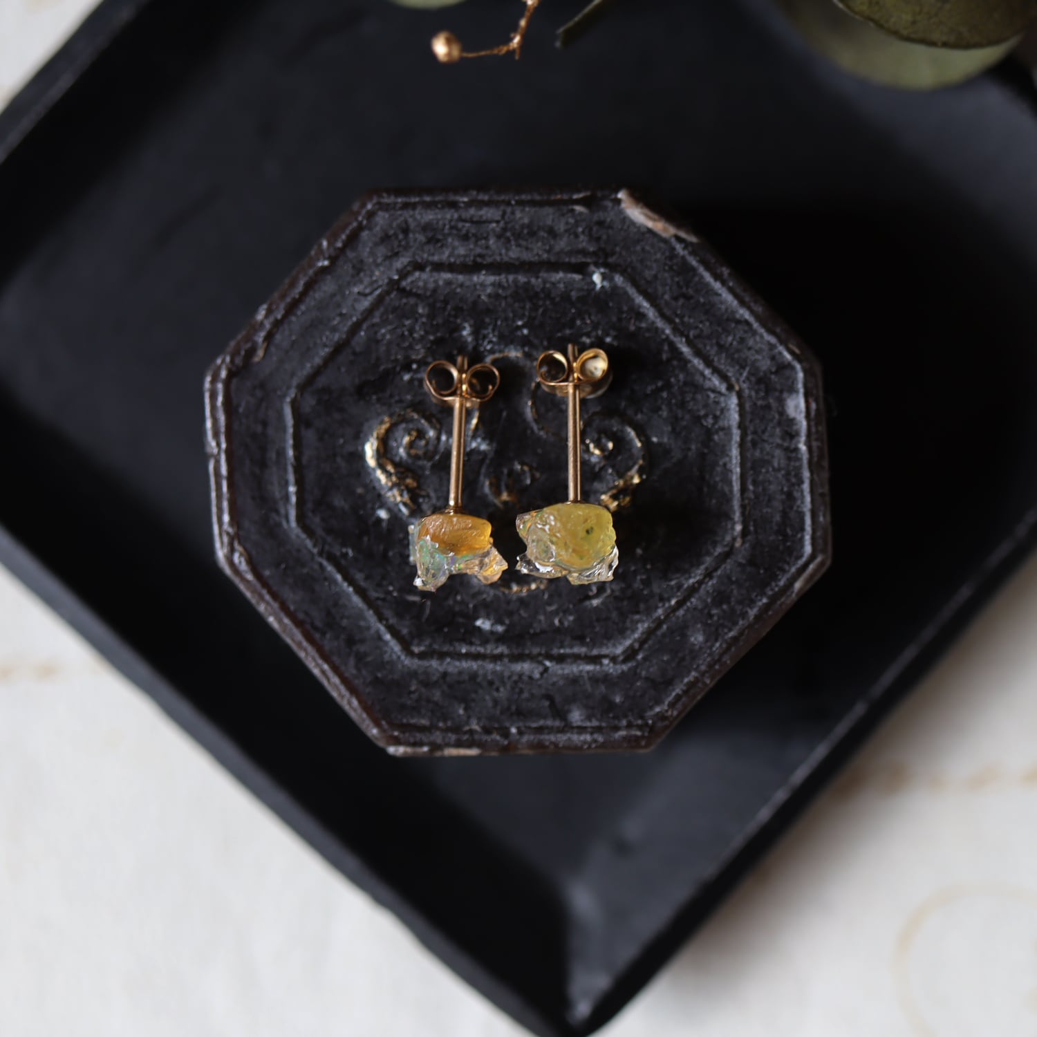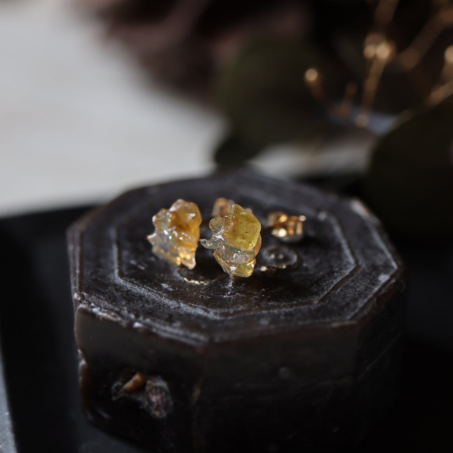 原石オパールとイエローサファイアのピアス