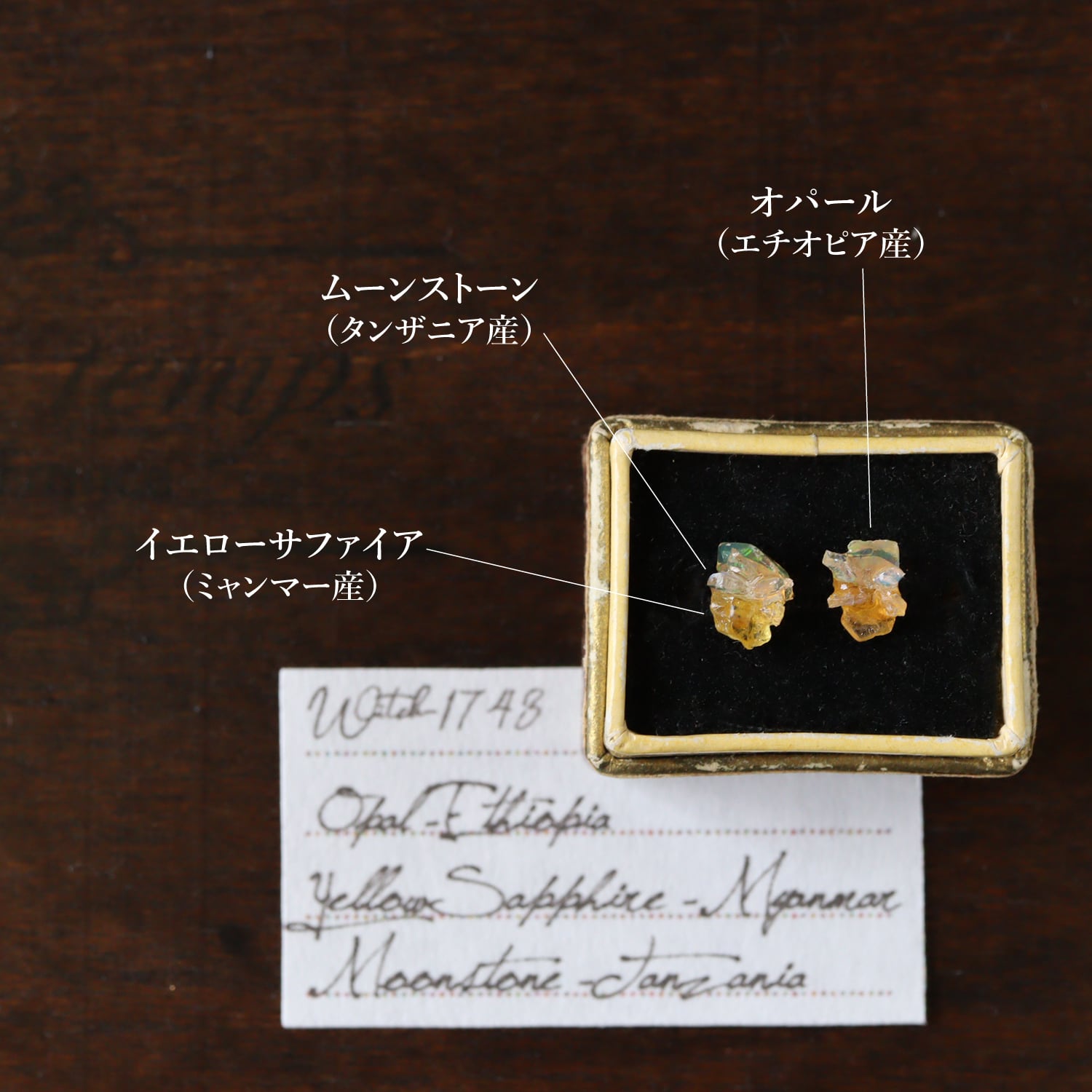 黄色みがかった半透明な中に虹色の遊色が浮かぶオパール。鮮やかなレモンイエローが美しいサファイア。月の光のような輝きのムーンストーン。表情の違う鉱物の小さな結晶が共生し響き合います。