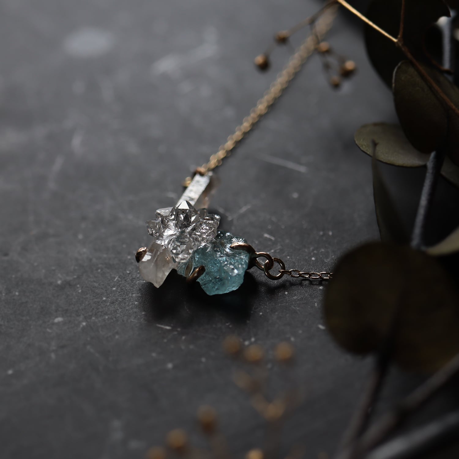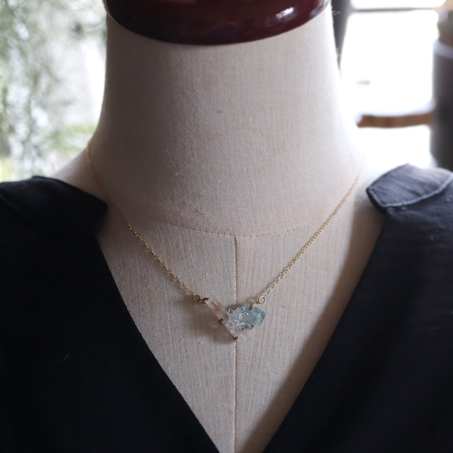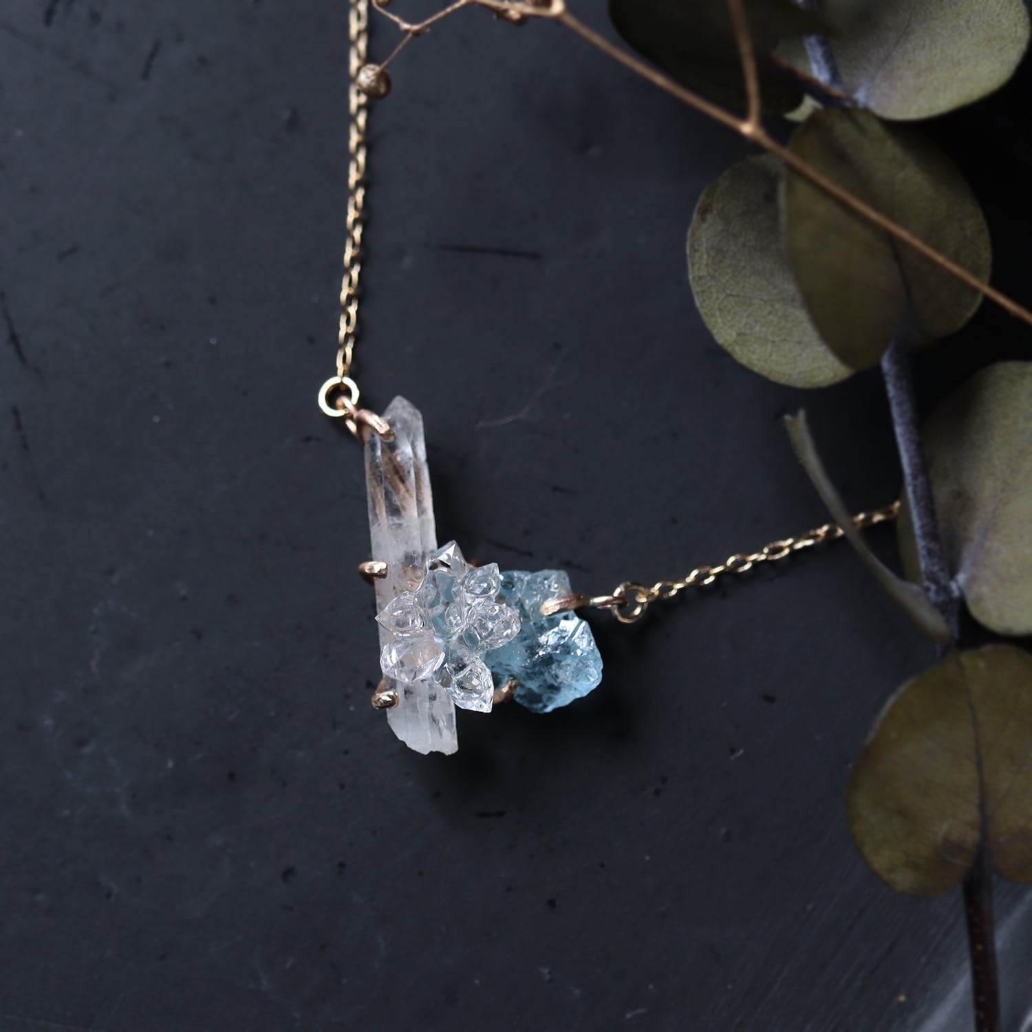 原石アクアマリン、クォーツ、ダイヤモンドクォーツが共生して結晶した、創造上の鉱物「Unionite」のネックレス。