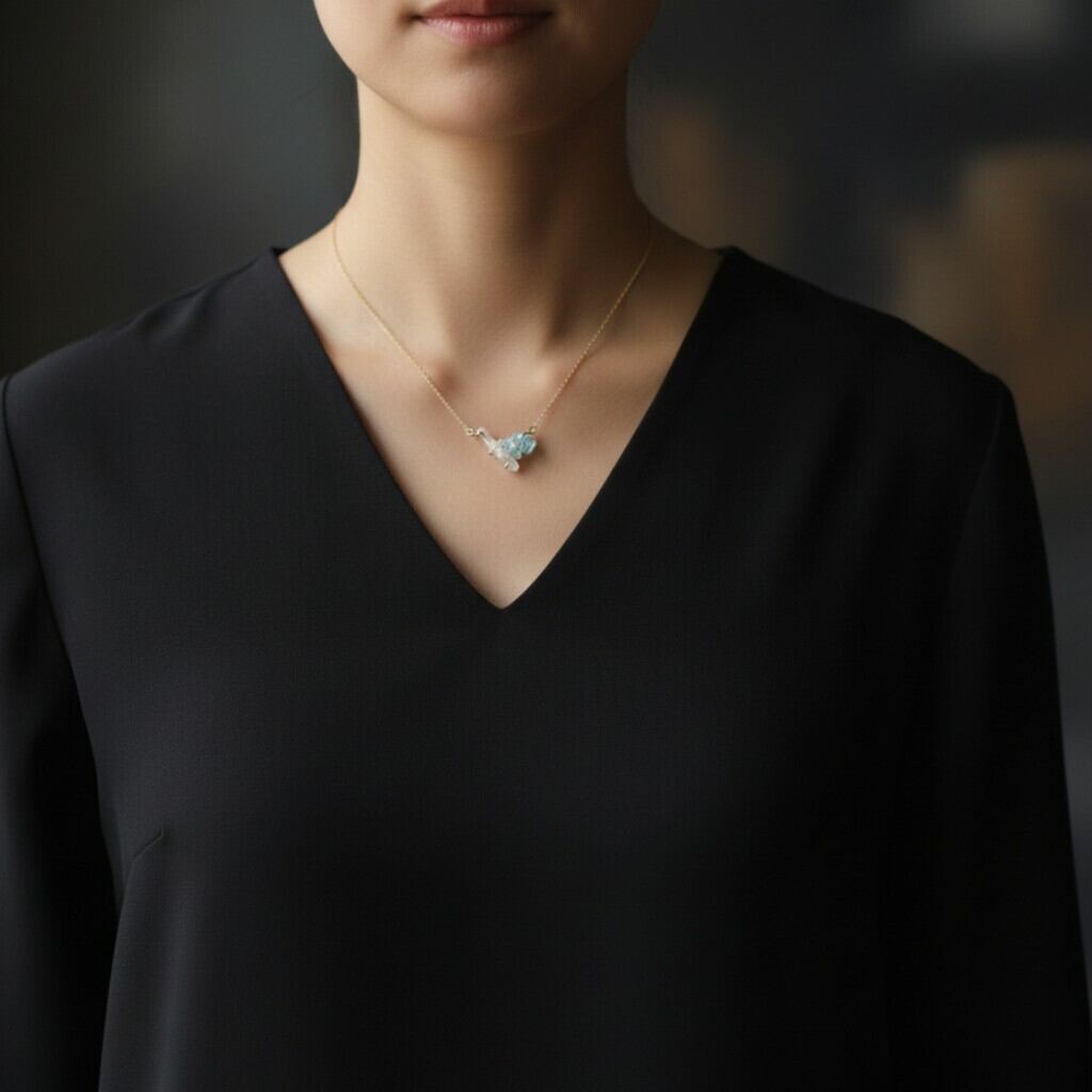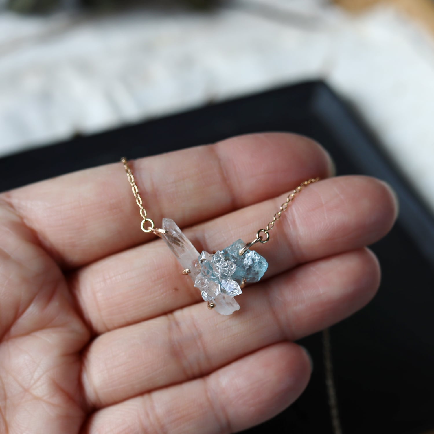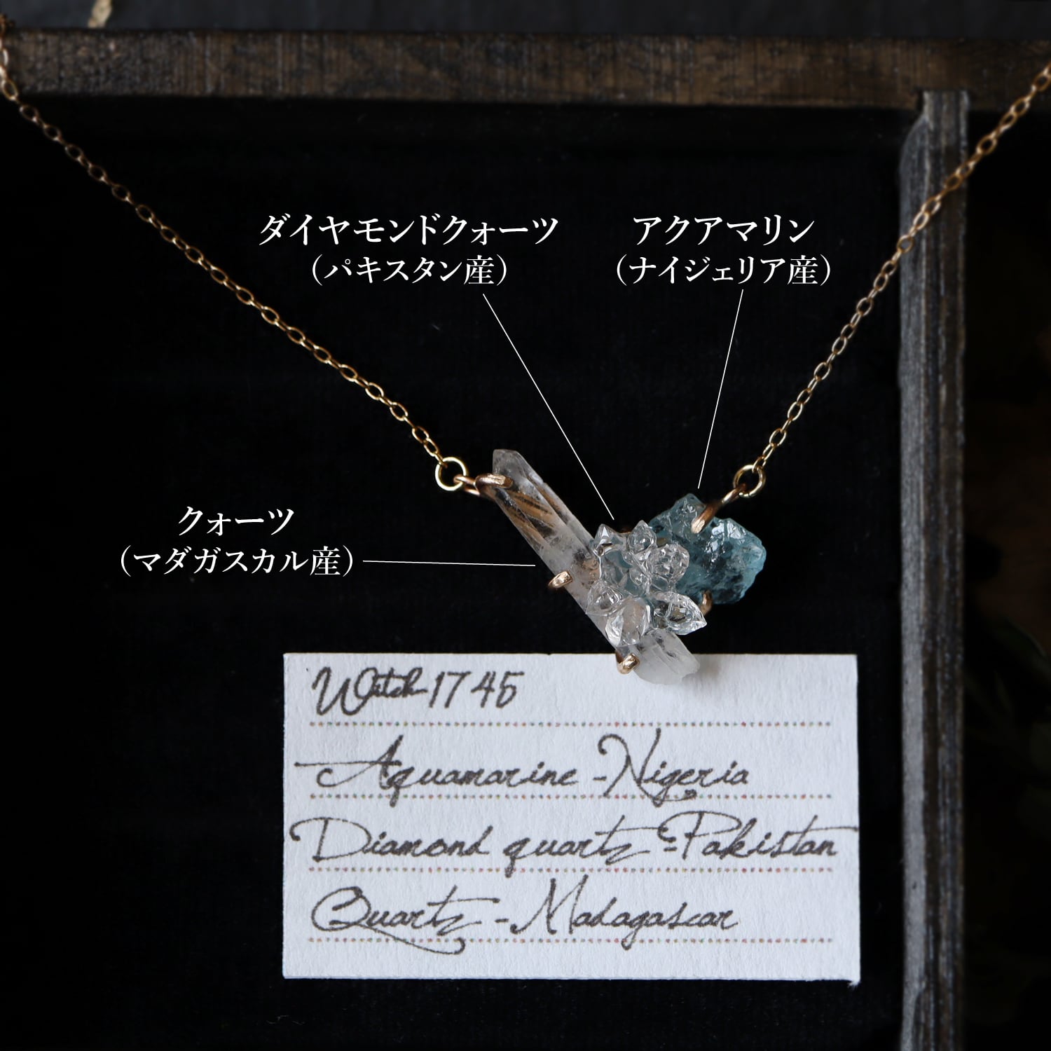 原石アクアマリン、クォーツ、ダイヤモンドクォーツが共生して結晶した、創造上の鉱物「Unionite」のネックレス。