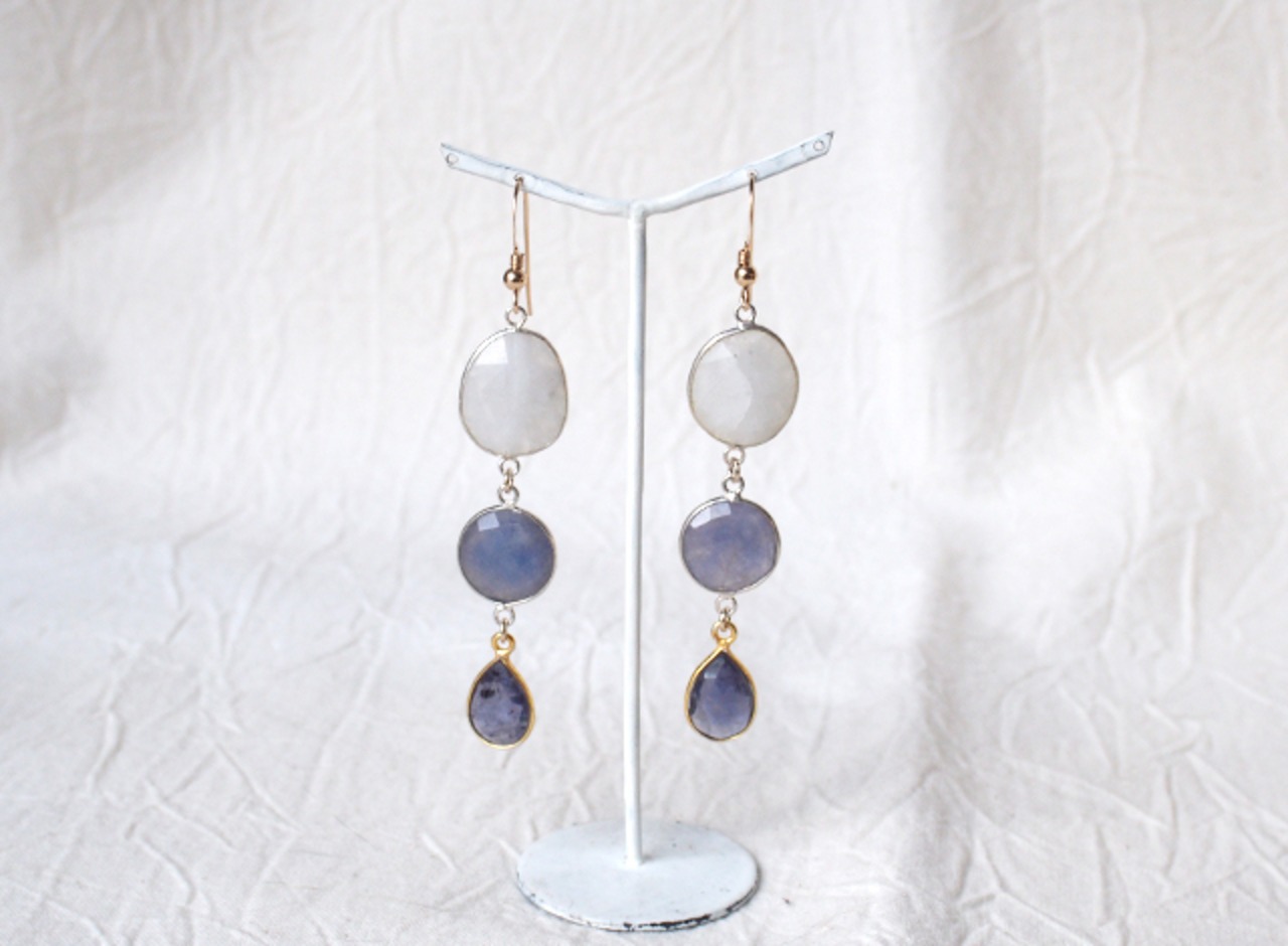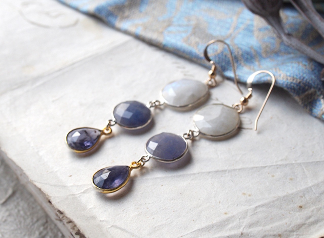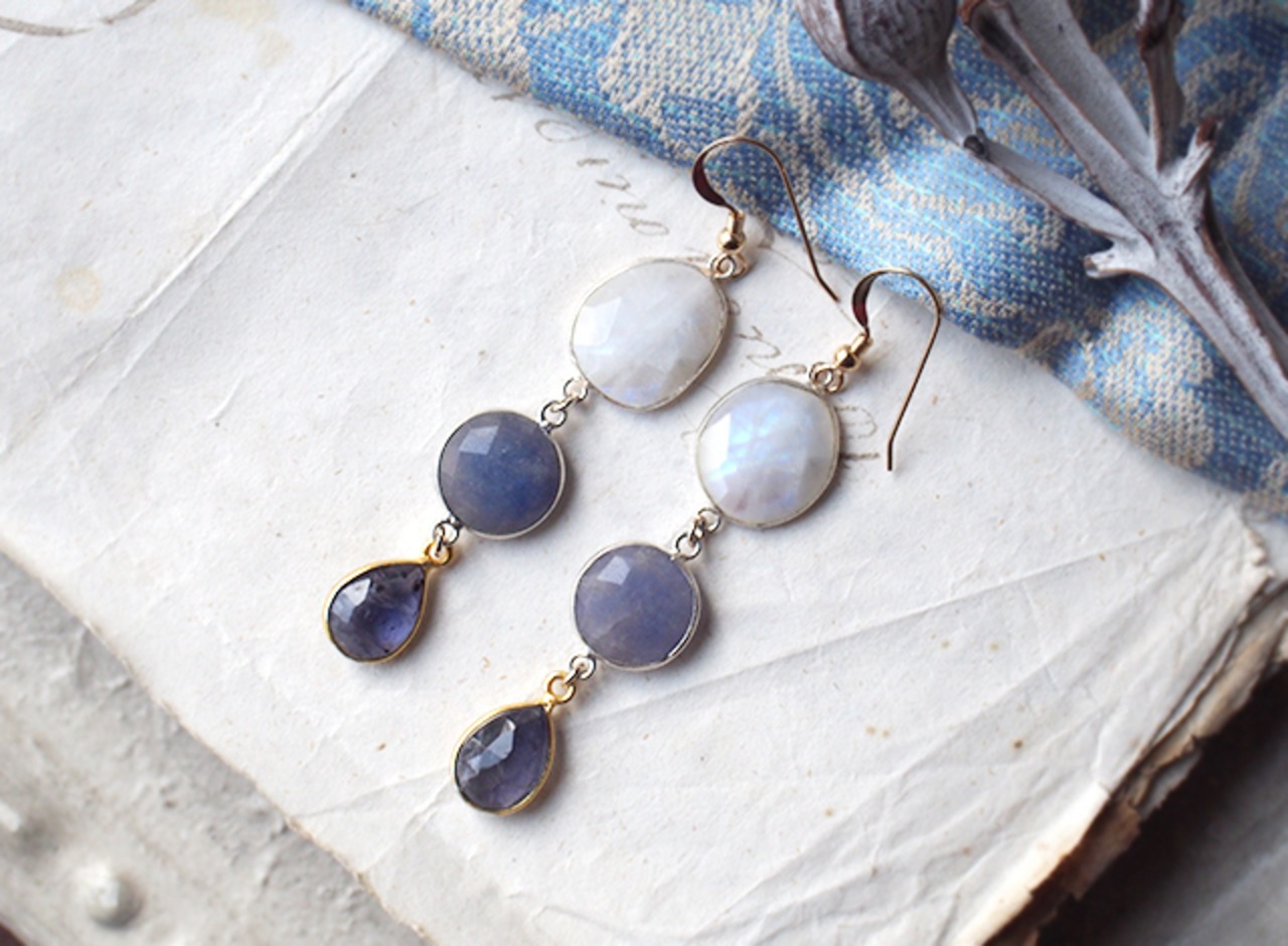 素材:ロイヤルブルームーンストーン・サファイア・アイオライト・シルバー(石枠/ゴールドプレート)・K14ゴールドフィルド(ピアス金具)