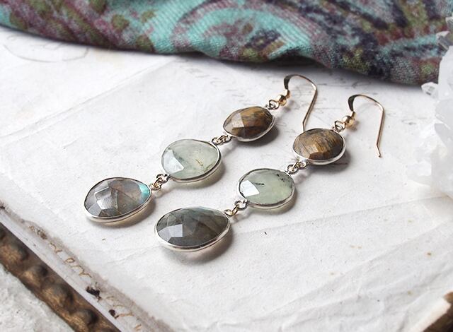 素材:タイガーアイ・プレーナイト・ラブラドライト・シルバー(石枠)・K14ゴールドフィルド(ピアス金具)