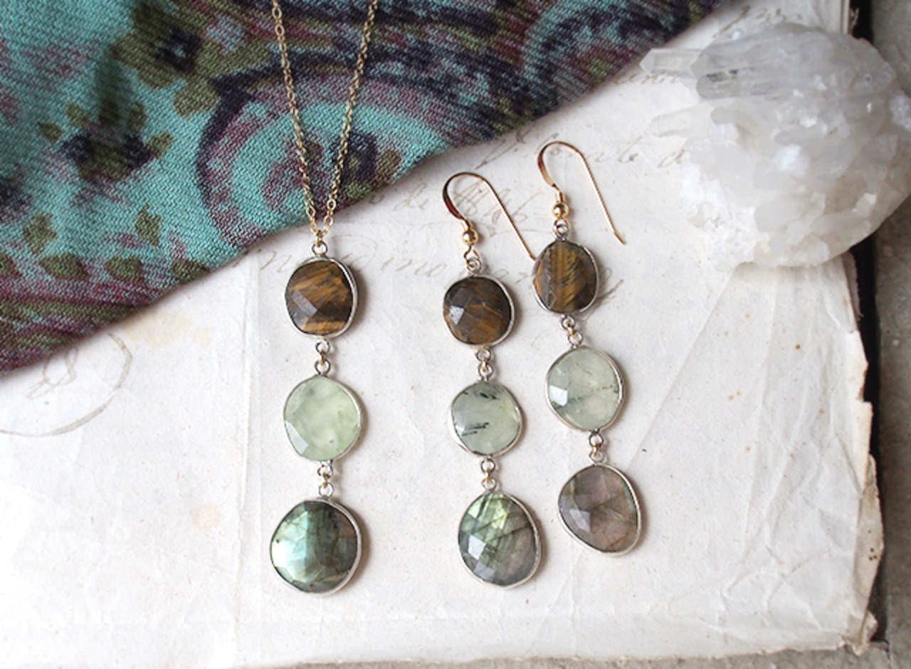 木の実の様なタイガーアイ、ライムグリーンのプレーナイト、ゴールド~グリーンの神秘的な光が浮かぶラブラドライト。
