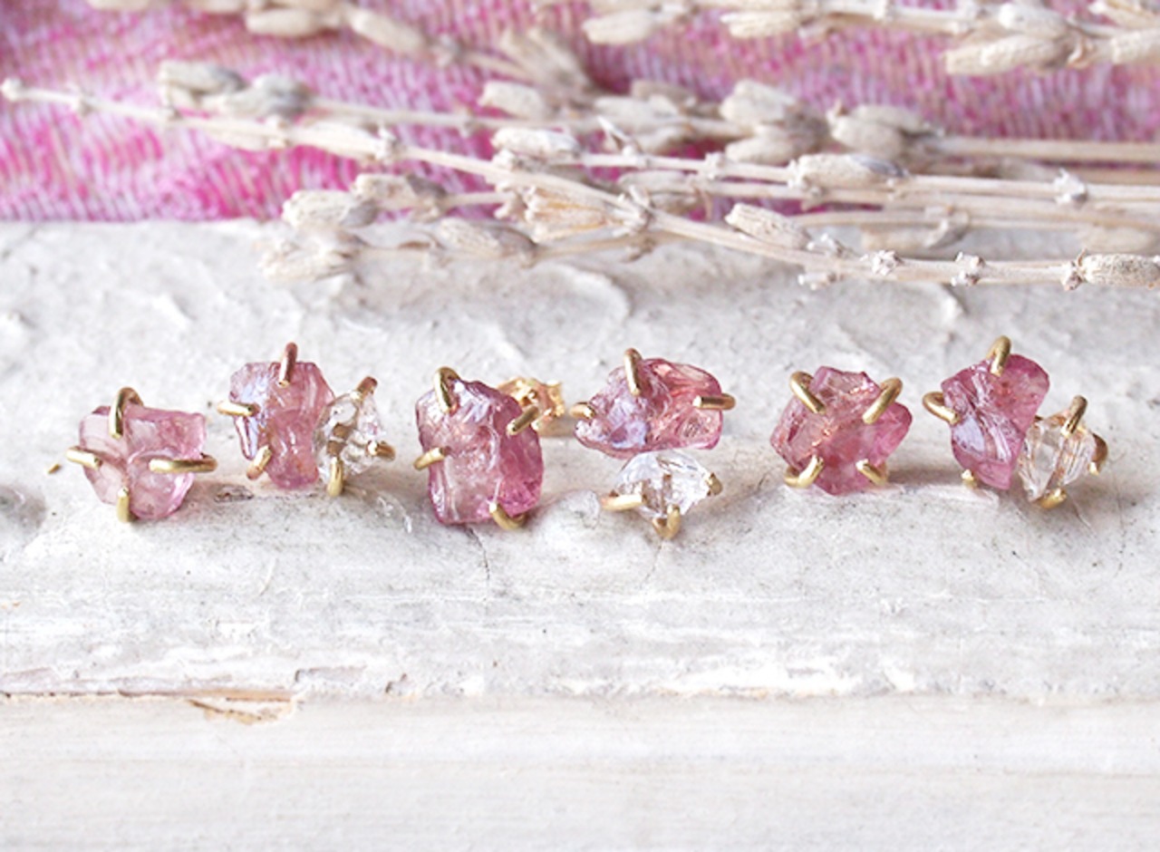 きらっと輝くダイヤモンドクォーツの結晶と合わせ、ラフでアシンメトリーなピアスにしました。