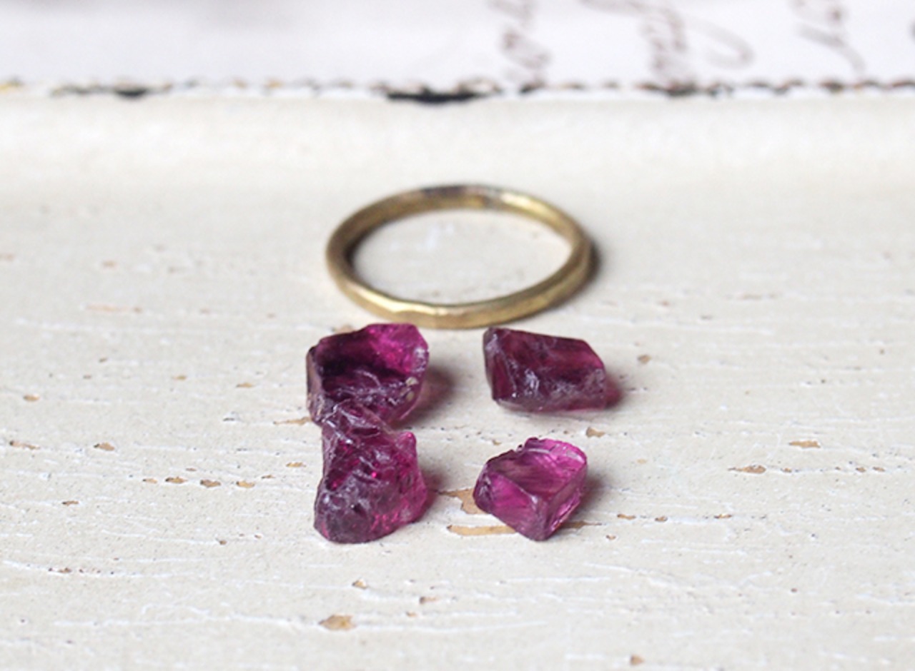 原石のロードライトガーネットのリング(左上の石)