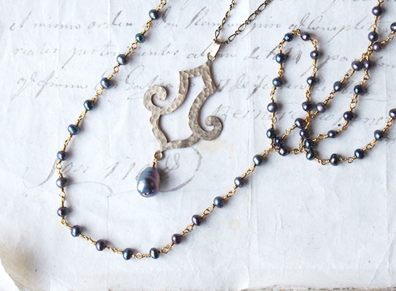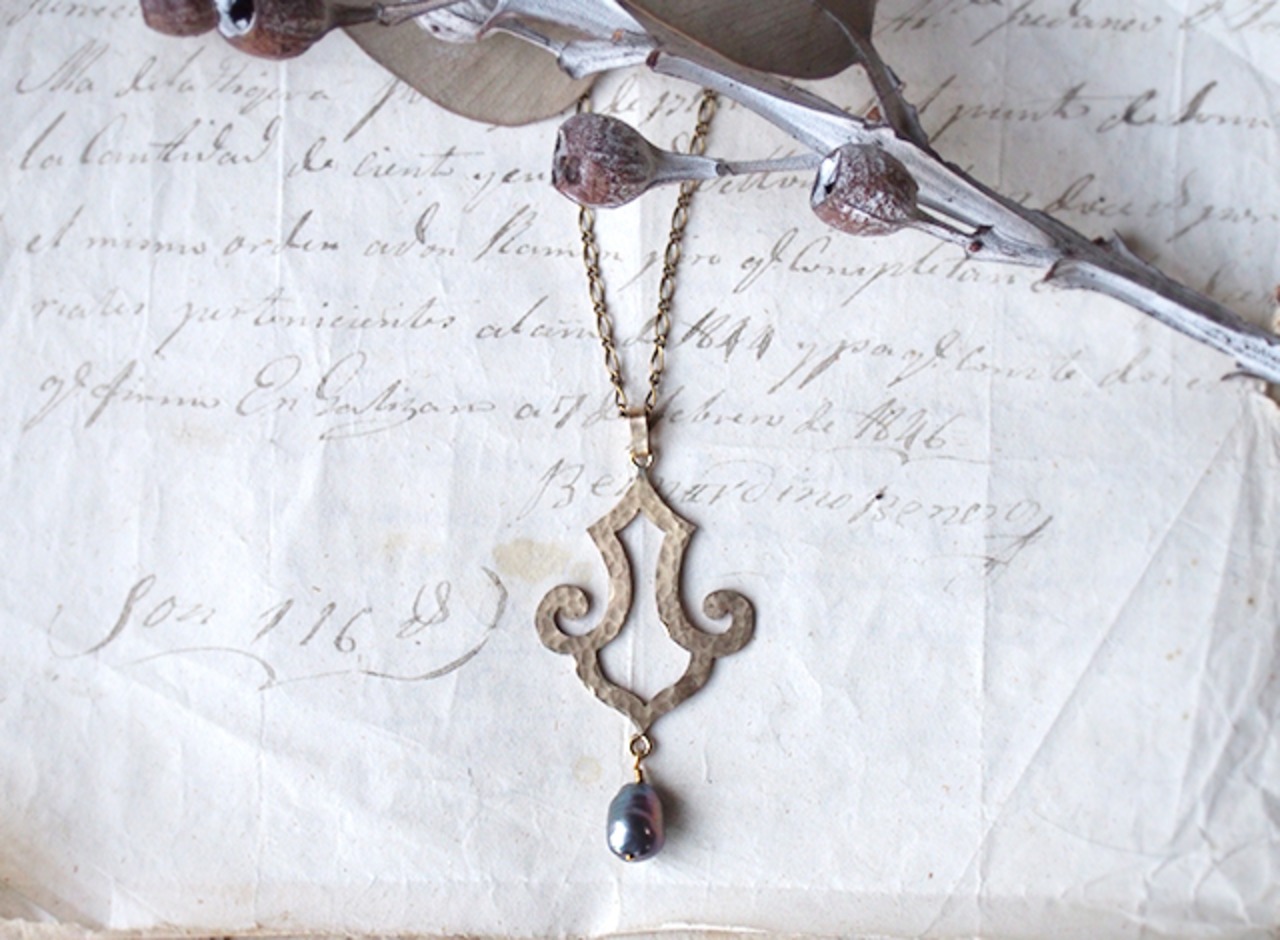 シックなグレーパールと、真鍮のオリエンタルなモチーフが揺れるロングネックレス。
