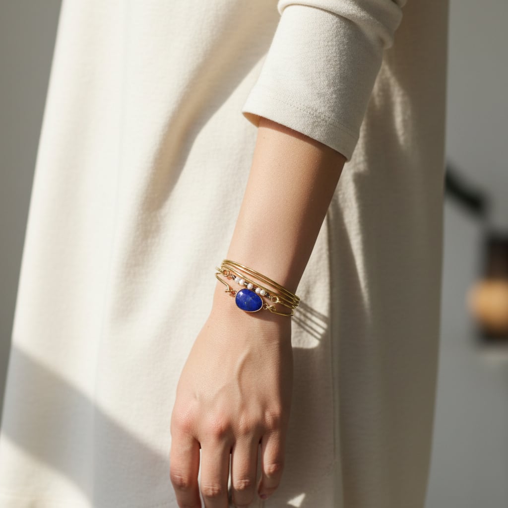 あたたかいゴールド色の真鍮と合わせ、シンプルなバングルにしました。