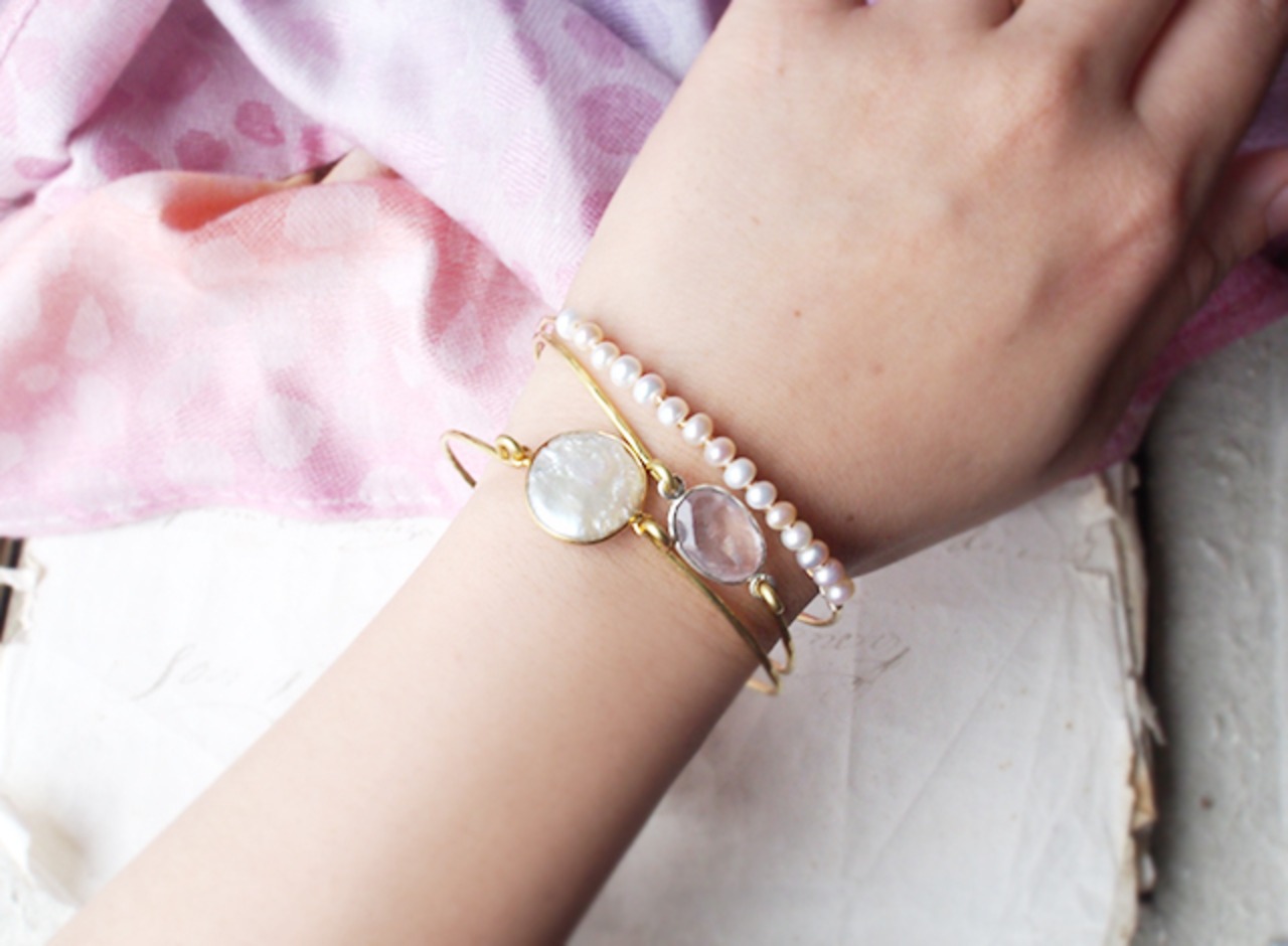 淡いピンクのローズクォーツ、上品の艶のコイン型パール、小さな粒が可憐に連なるベビーパールのバングル。
