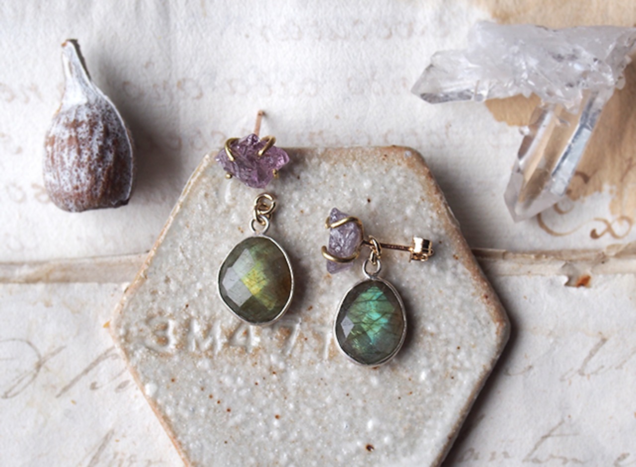 甘く落ち着いた赤紫のスピネルと、角度によって神秘的な光が浮かぶラブラドライト。