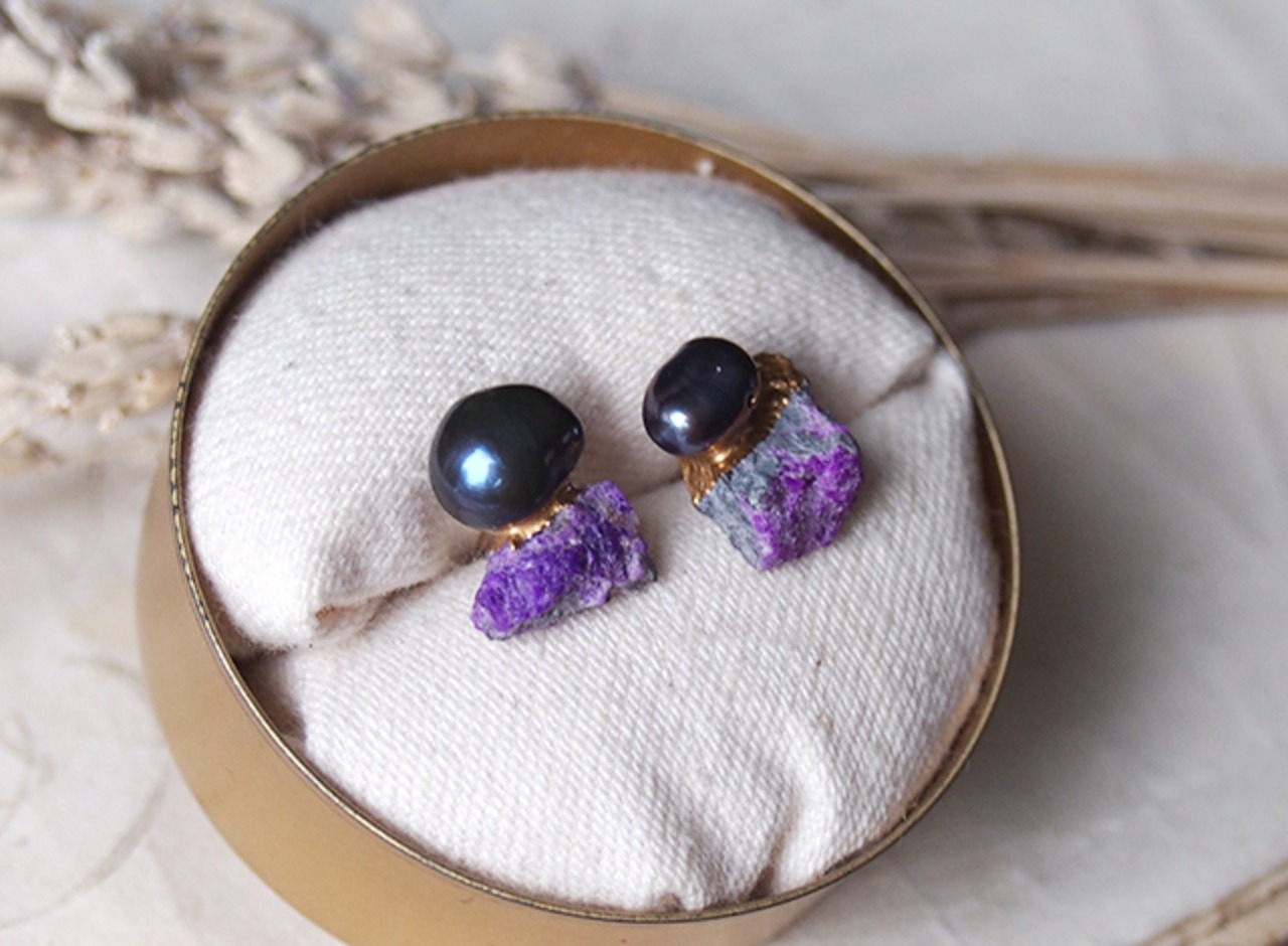 【一点物】原石のスギライト・パールの金継ぎピアス