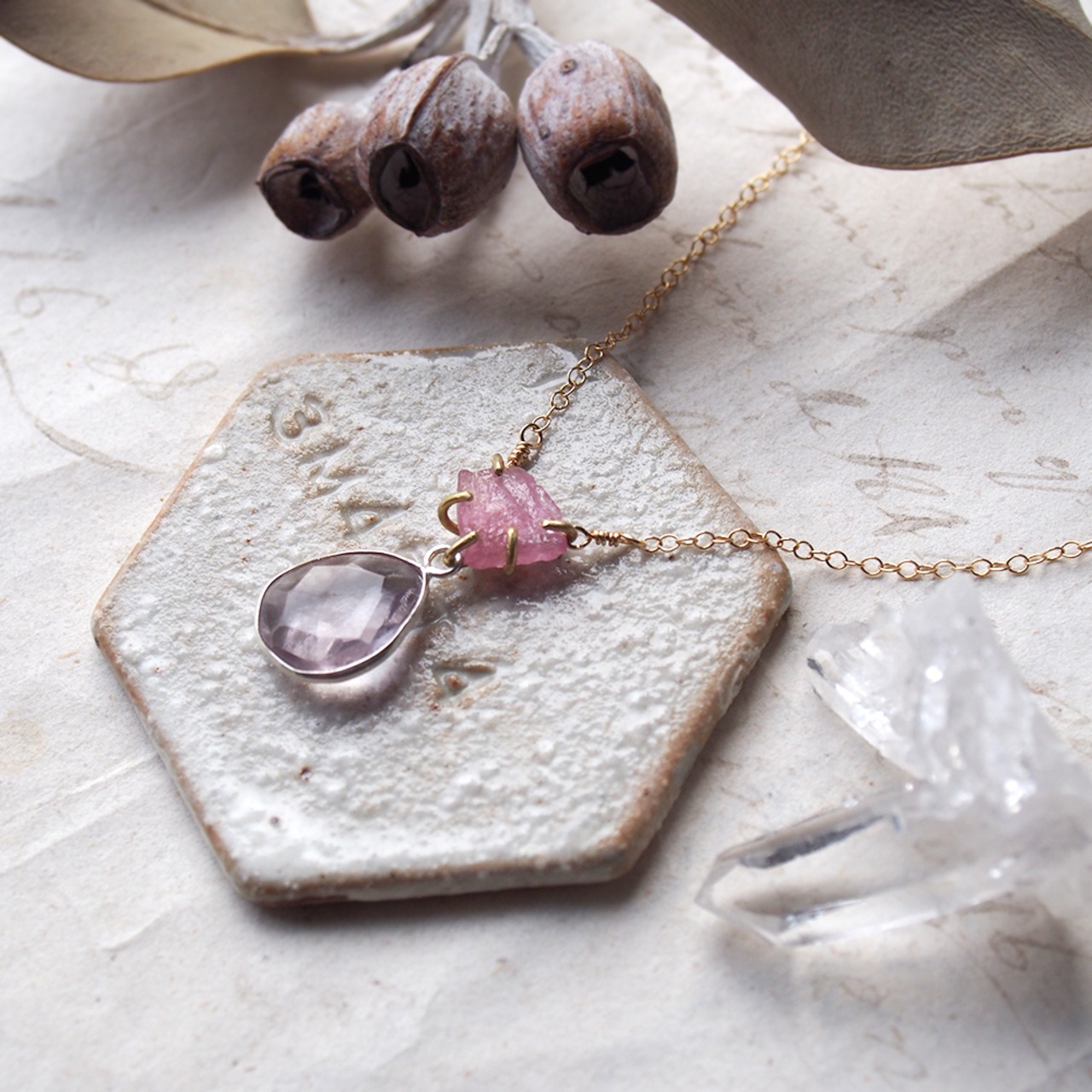 鮮やかな甘いピンク色のトルマリンと、にじむような紫色のアメジスト。