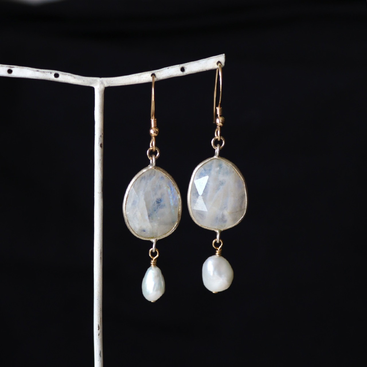 白の中に神秘的な光が浮かぶロイヤルブルームーンストーンと、自然な形と上品な輝きのパール。