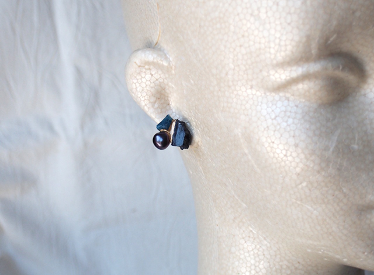 柱状結晶そのままのマットなブラックのトルマリン、深い群青色のアパタイト、シックなブラックのパール。