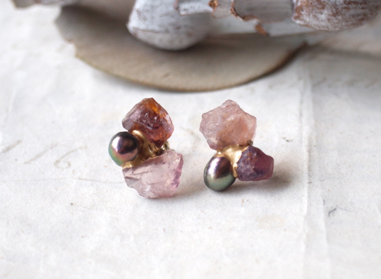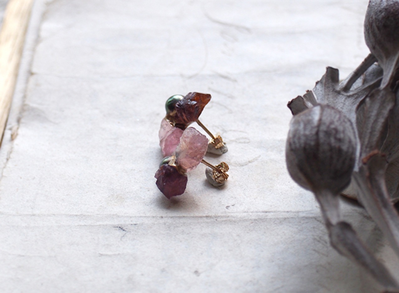 優しいバラ色のローズクォーツ、原石らしい無骨な表情のルビーと、キャンディのようなピンクのスピネル、艶っぽいグレーパール。