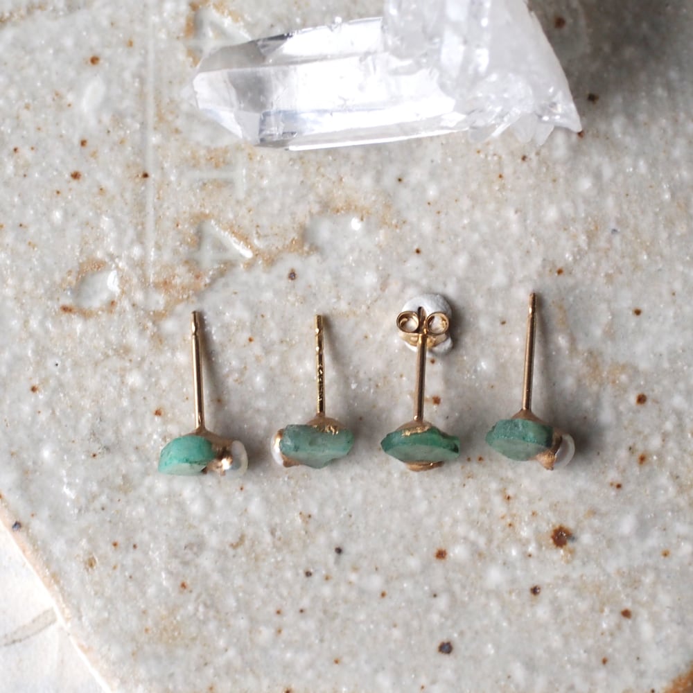 原石エメラルドとパールの金継ぎプチピアス w1020