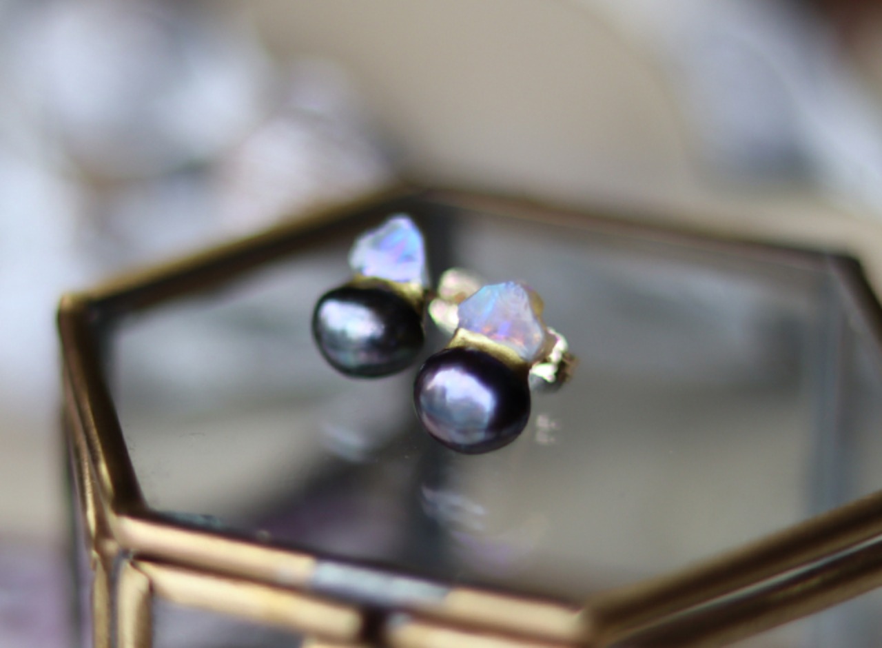 原石オパールとパールの金継ぎピアス won31f