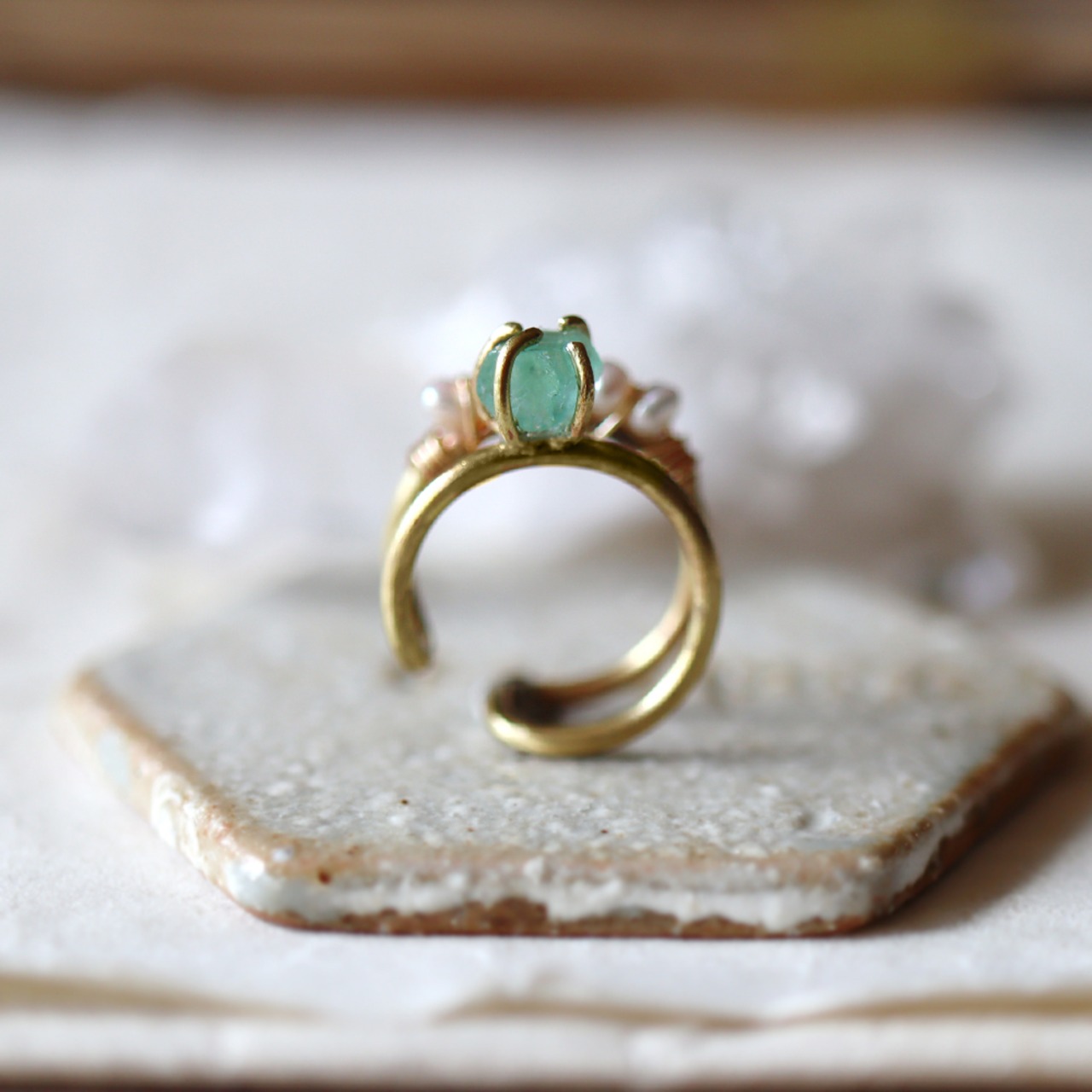 【一点物/S】原石エメラルドとパールの2連イヤーカフ