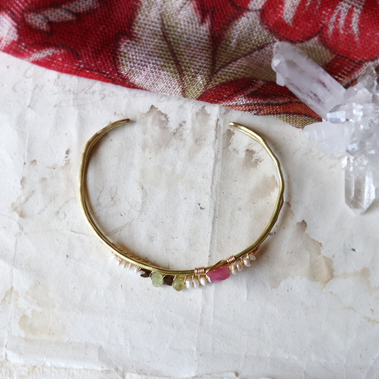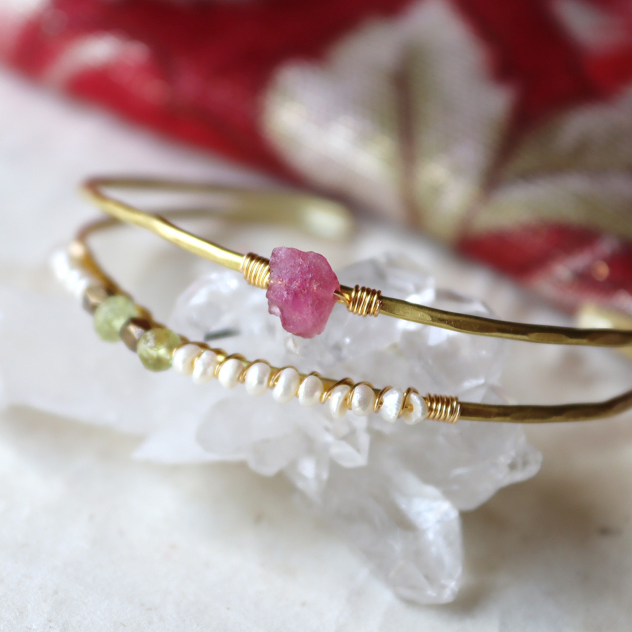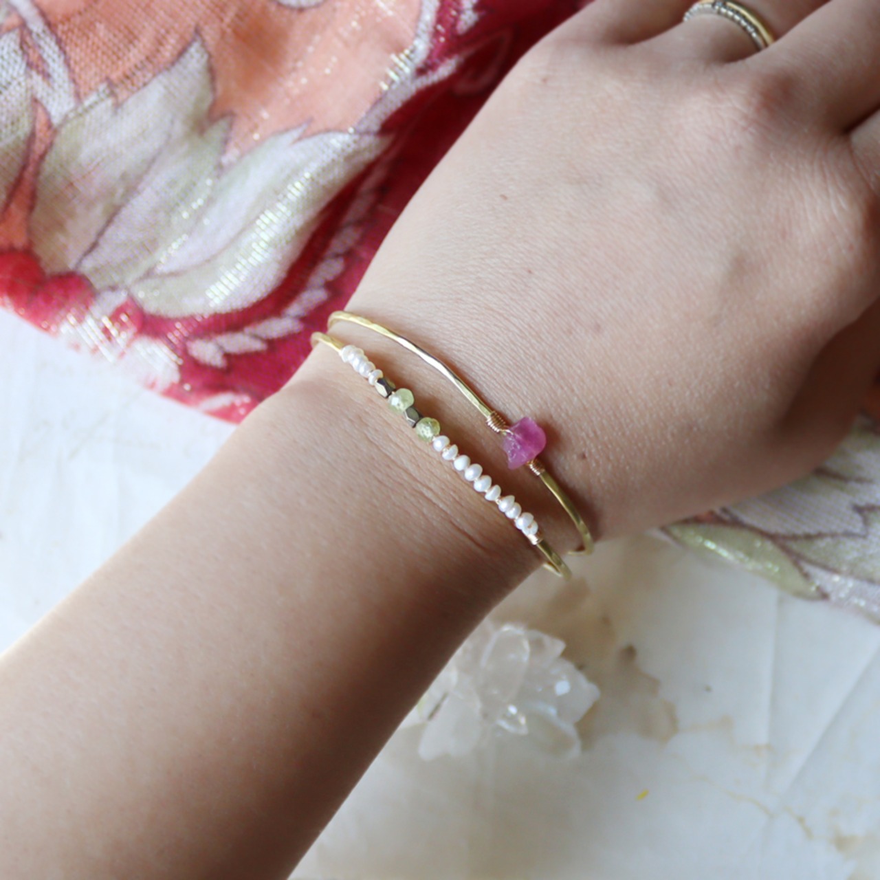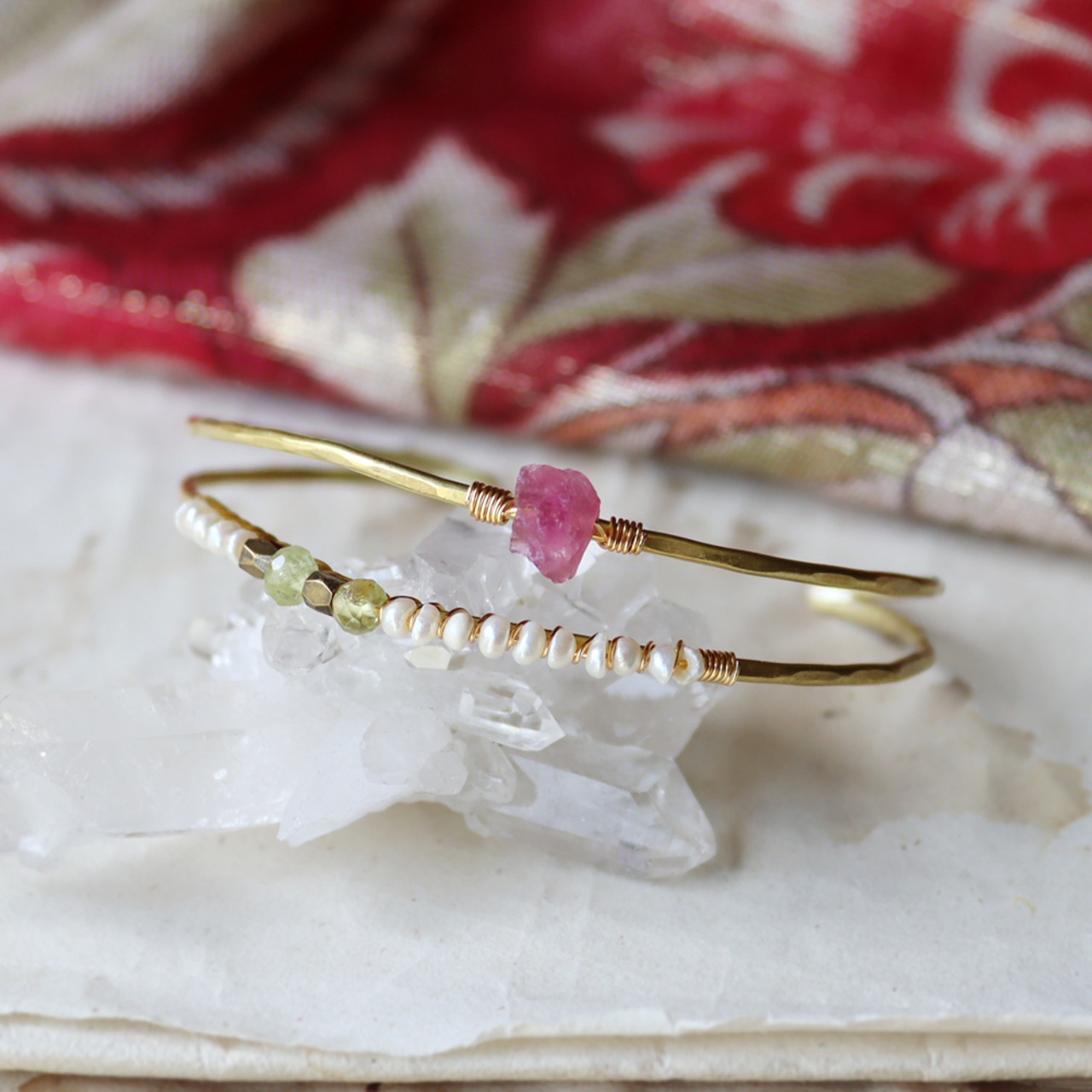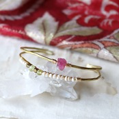それぞれの天然石の個性豊かな表情が響き合い、手首を華やかに飾る2連のバングルです。