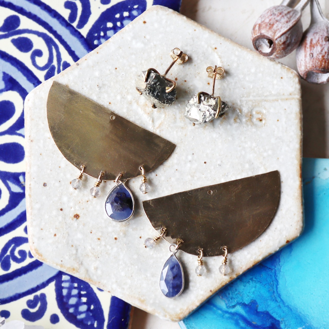 無骨な金属光沢の原石パイライト、深いブルーのサファイア、角度によってブルーの光が浮かぶ小粒のラブラドライト。