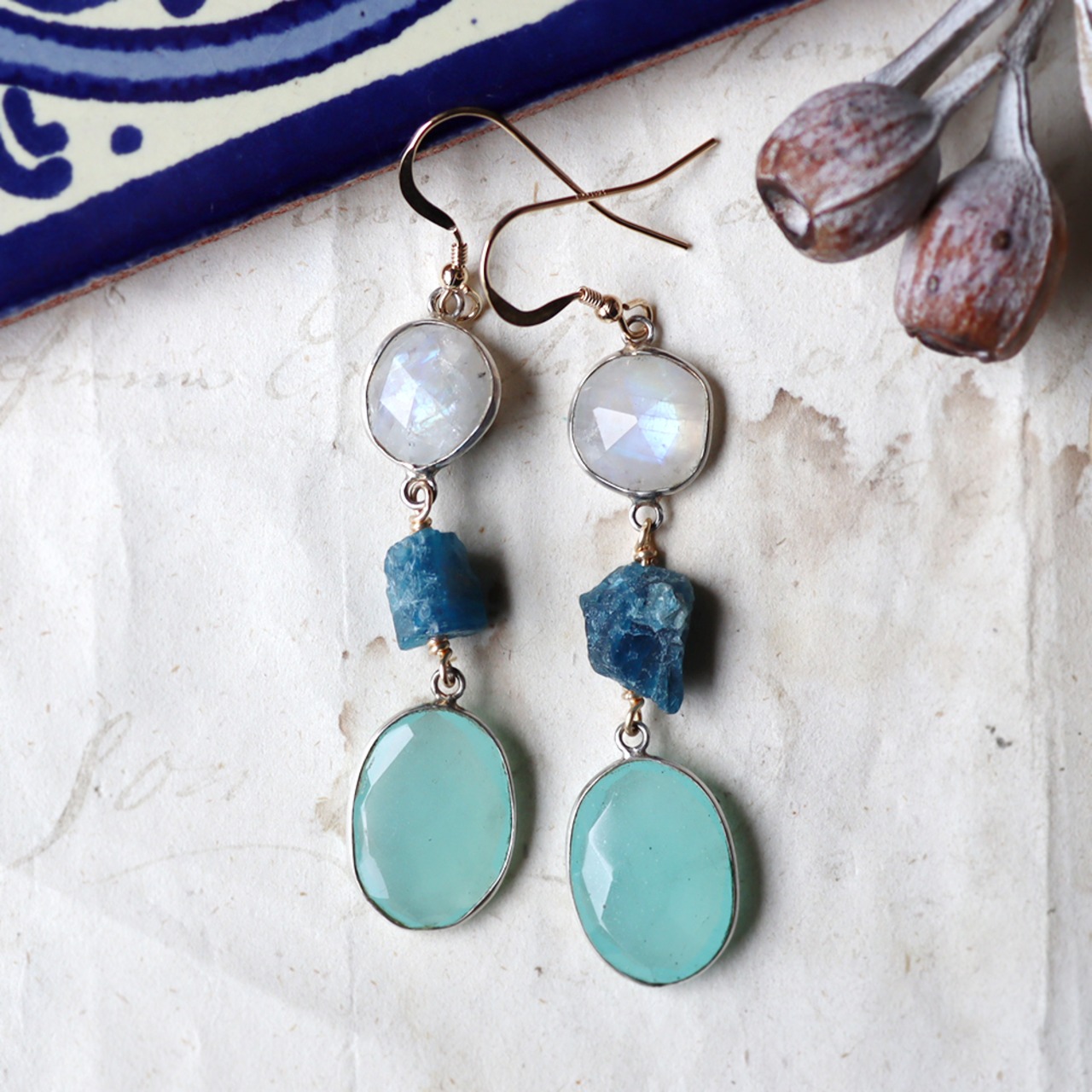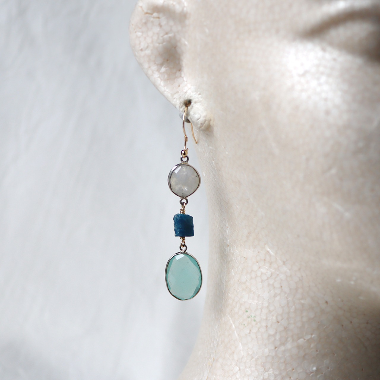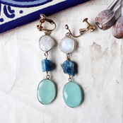 素材:ロイヤルブルームーンストーン・アパタイト・カルセドニー・シルバー(石枠)・K14ゴールドフィルド(ピアス金具)