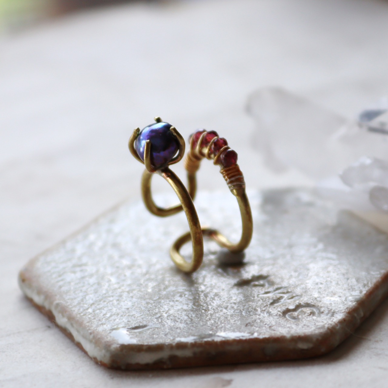 それぞれ色形表情の違う天然石が響き合う、2連のイヤーカフです。