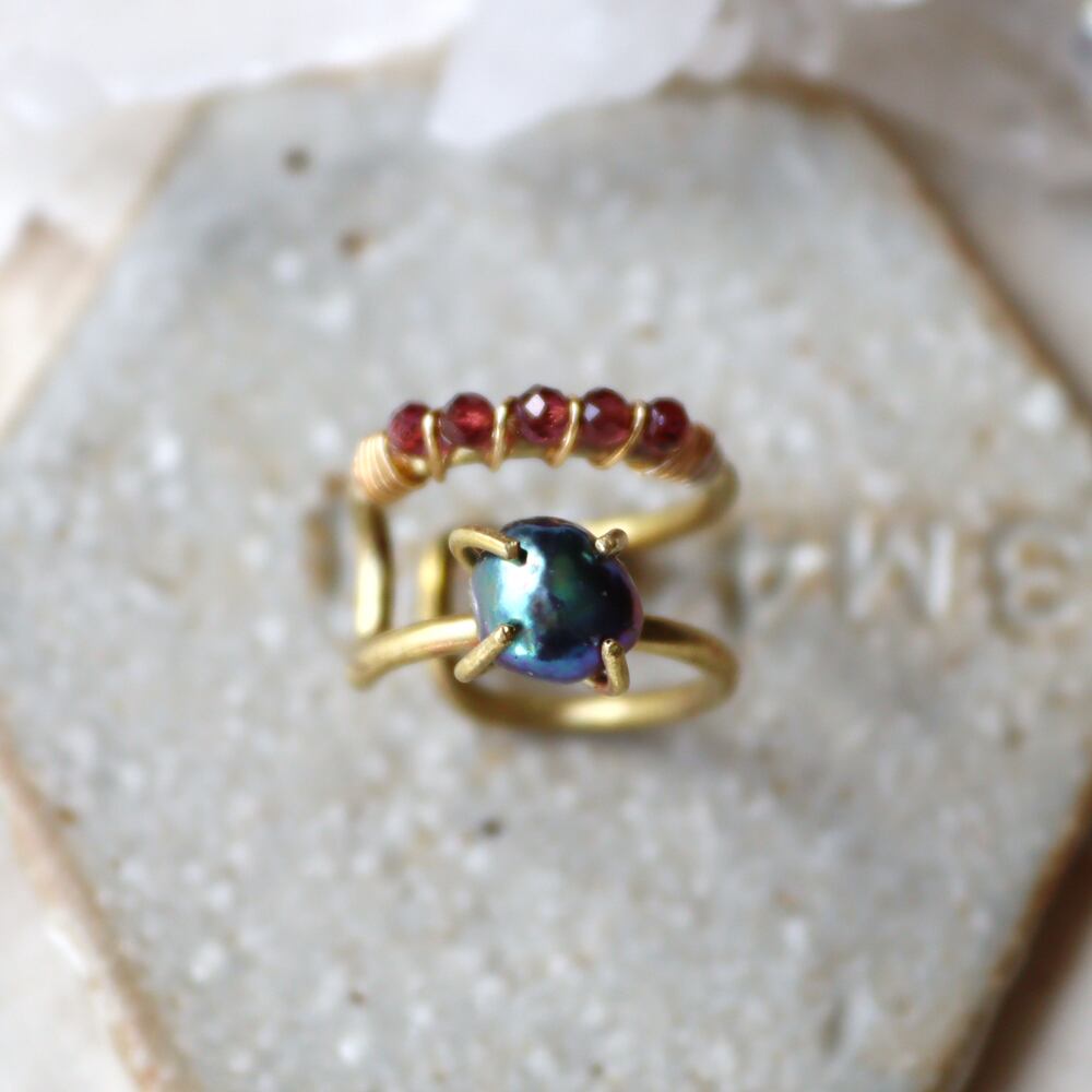 【一点物】グレーパールとガーネットの2連イヤーカフ