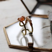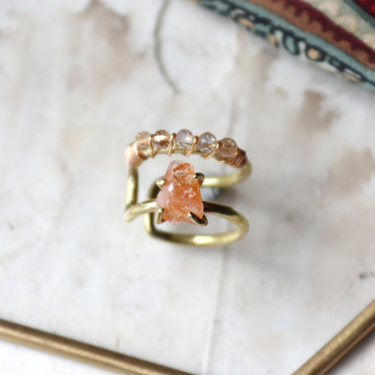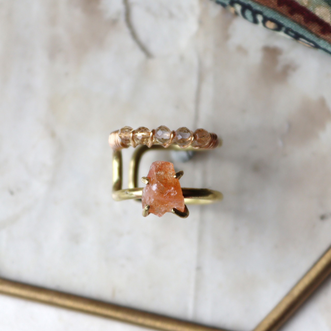 ビビットなオレンジ、内包物がきらきらと光る原石のサンストーンと、細かいカットに光がきらりと反射する小粒のクォーツ。