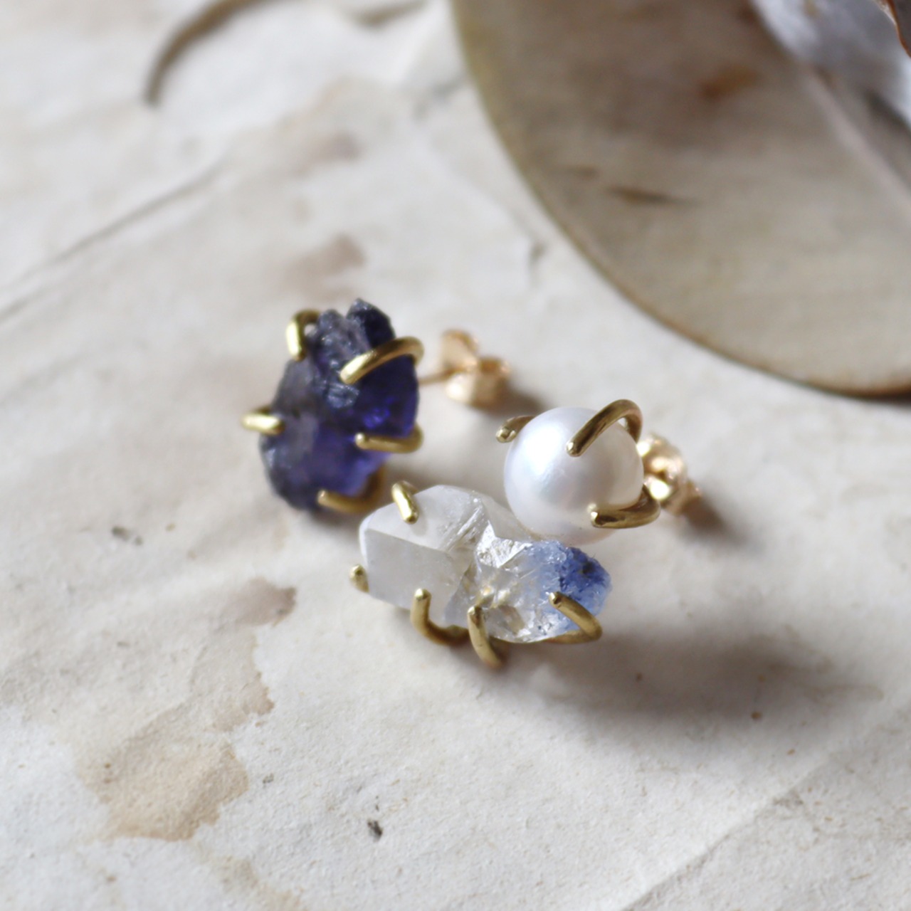 深いすみれ色のアイオライト、上品な輝きのパール、鉛筆型の結晶に青い内包物が浮かぶデュモルチライトインクォーツ。