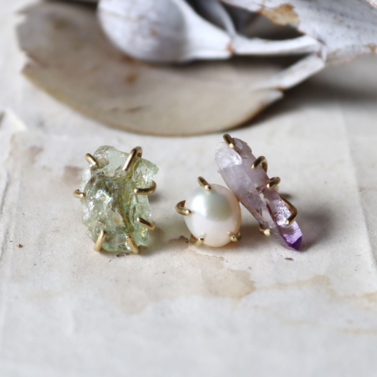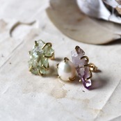 凛とした淡いグリーンのベリル、結晶そのままの鉛筆型とグラデーションが美しいアメジスト、上品な艶のパール。