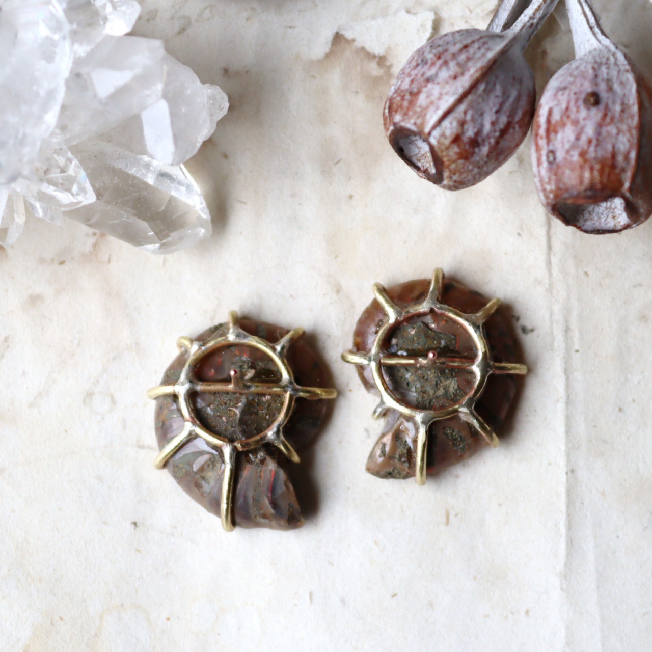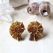 化石を半分にスライスした一対を、真鍮の爪で有機的に留めてピアスにしました。