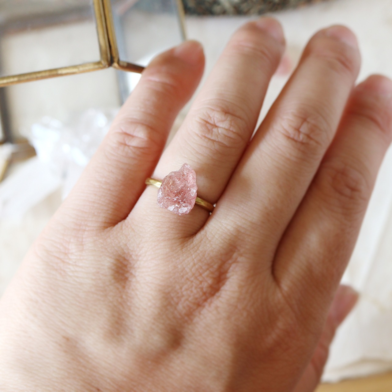 クォーツの中にピンク色の内包物が浮かぶ、かわいらしいストロベリークォーツ