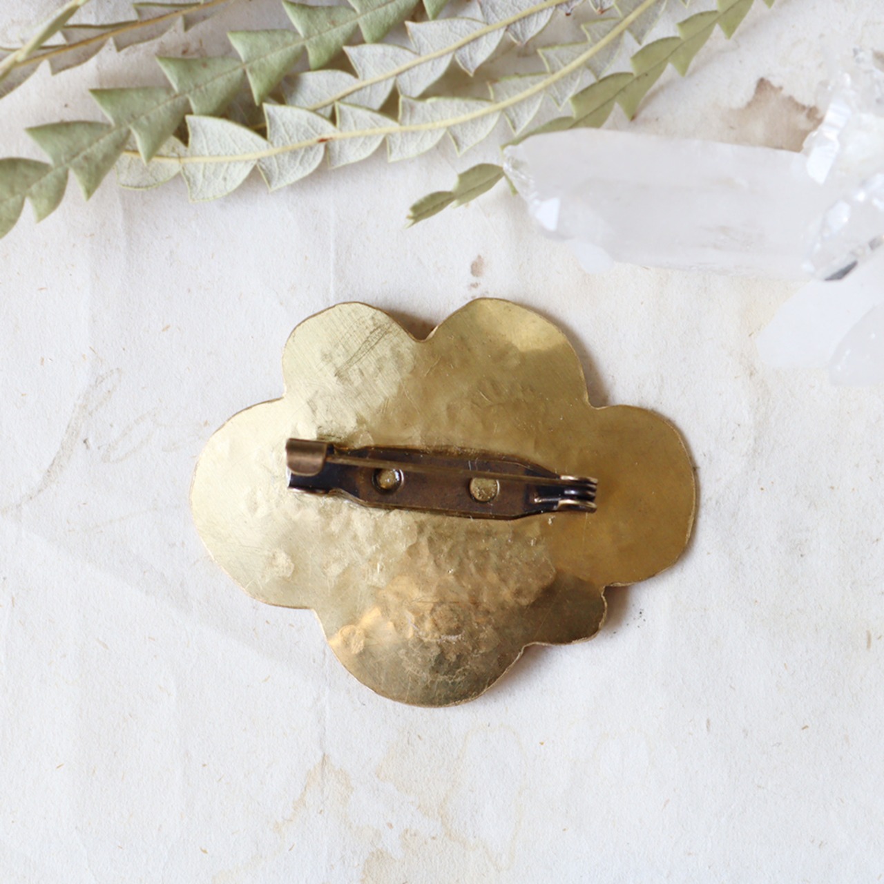 お花や雲を思わせる真鍮の上に、天然石の個性的な表情を金継ぎでまとめたブローチです。