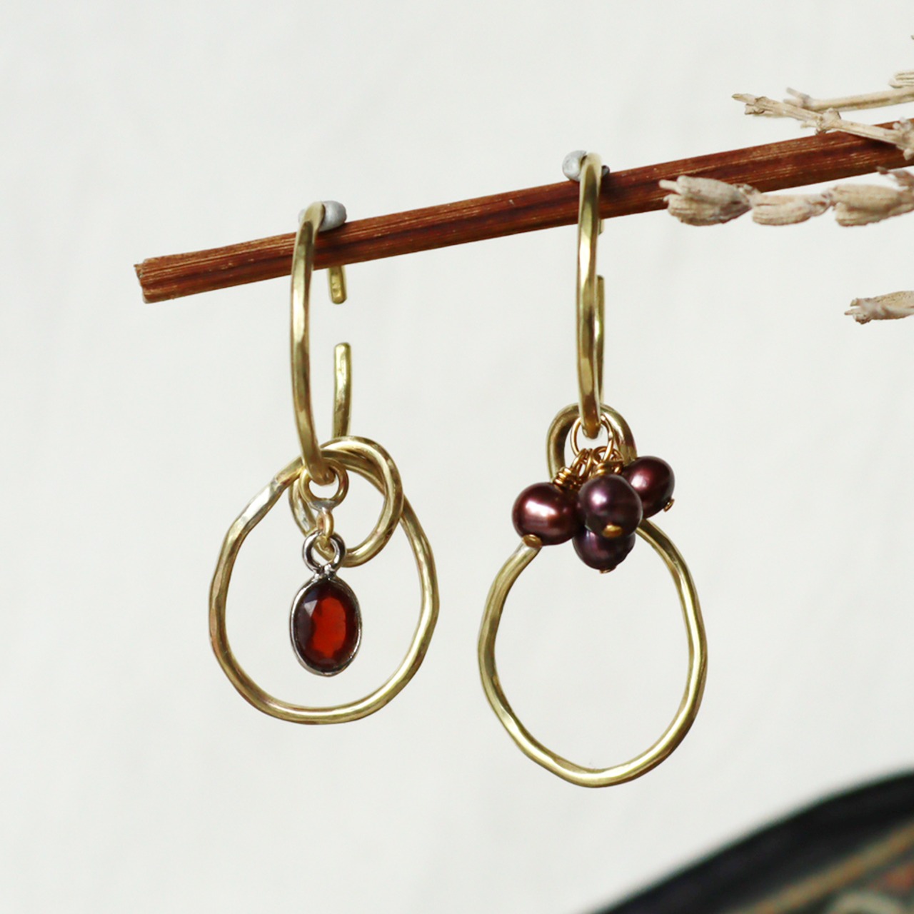 こっくり深い赤のガーネット、ブーケのように広がる赤茶色のパール、ラフな真鍮のパーツ。
