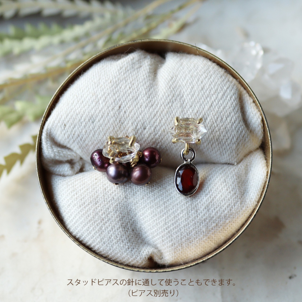 パーツはそれぞれ他のスタッドピアスの針に通してもお使いいただけます。