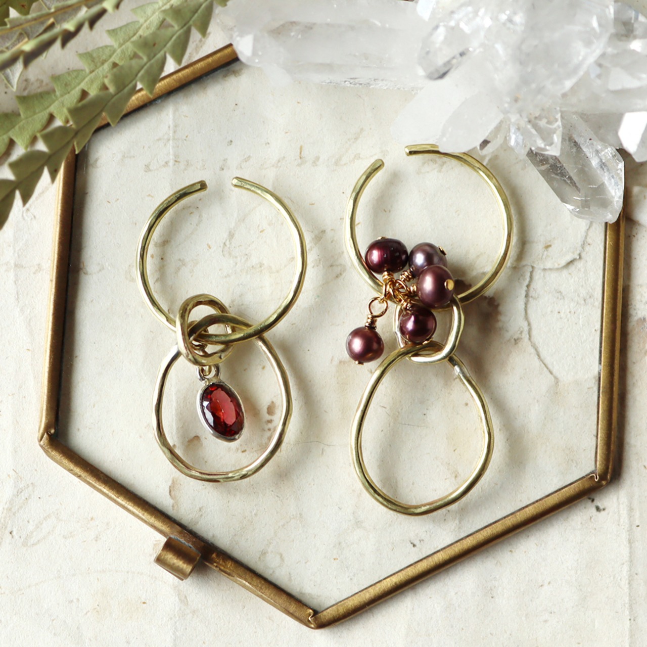 ガーネット・パール・真鍮のぶら下がりイヤーカフ w1162