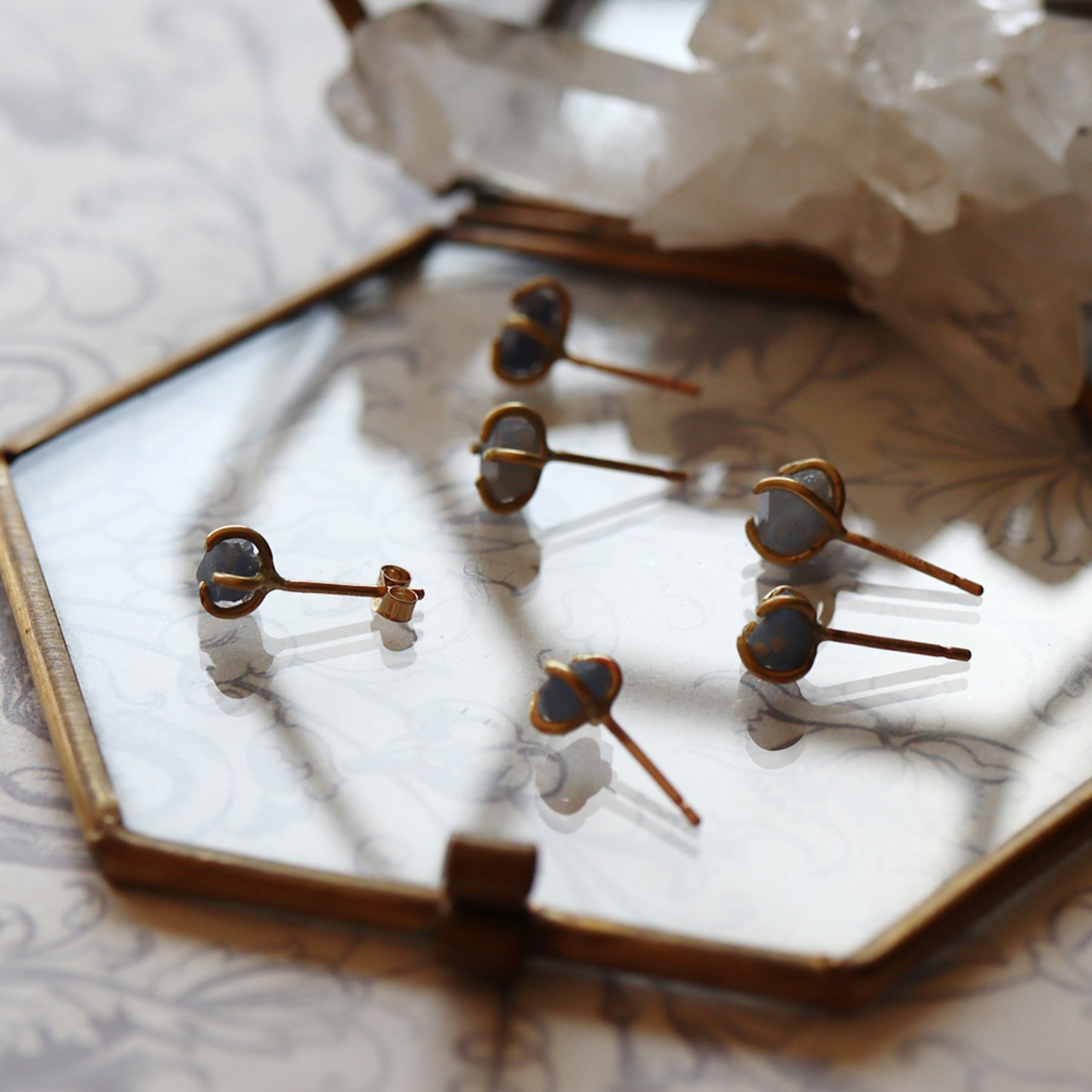 天然石の小さなかけらを真鍮の爪でラフに留めた、シンプルなピアスです。